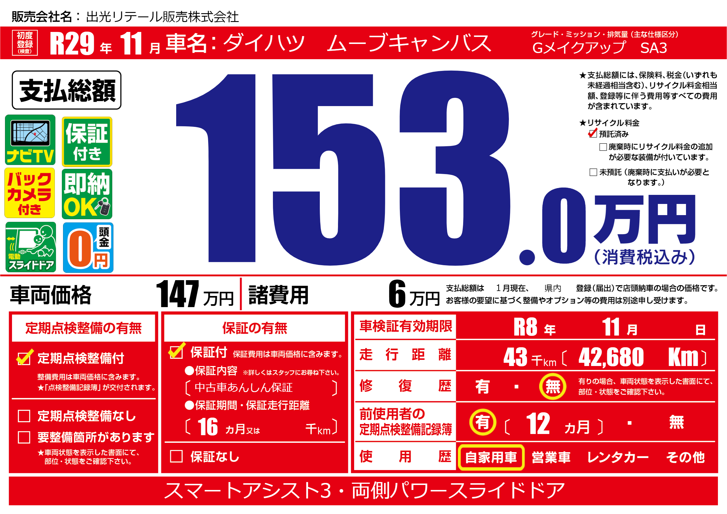 | 走行キロ | 4.3万km | 初年度登録 | R29年11月 |