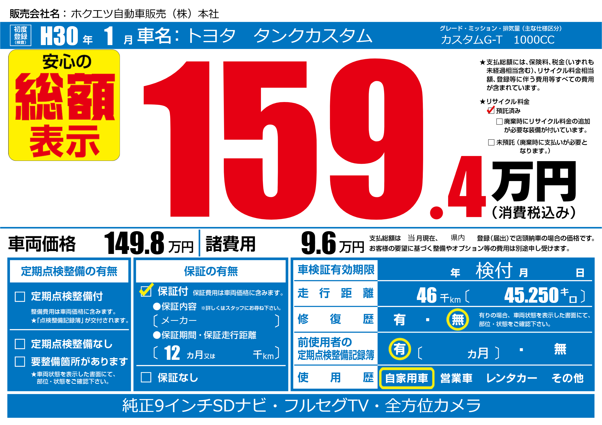 | 車名 | トヨタ タンクカスタム | グレード ミッション 排気量 |