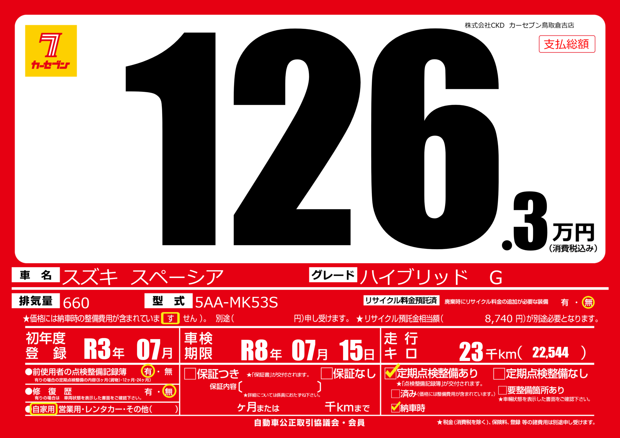 | 走行キロ | 2.3万km | 初年度登録 | R3年07月 |