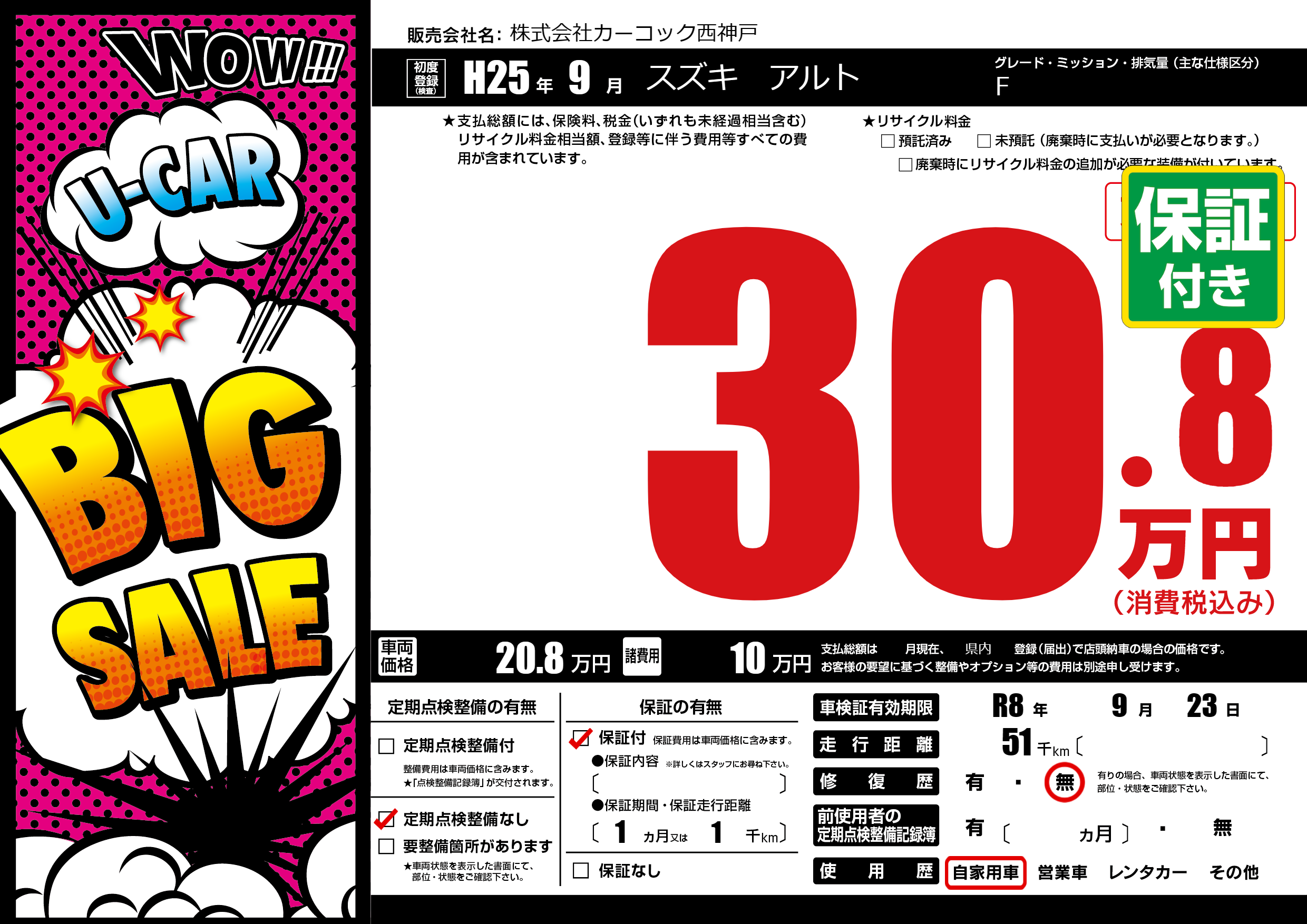 | 車名 | スズキ アルト | グレード ミッション 排気量 |