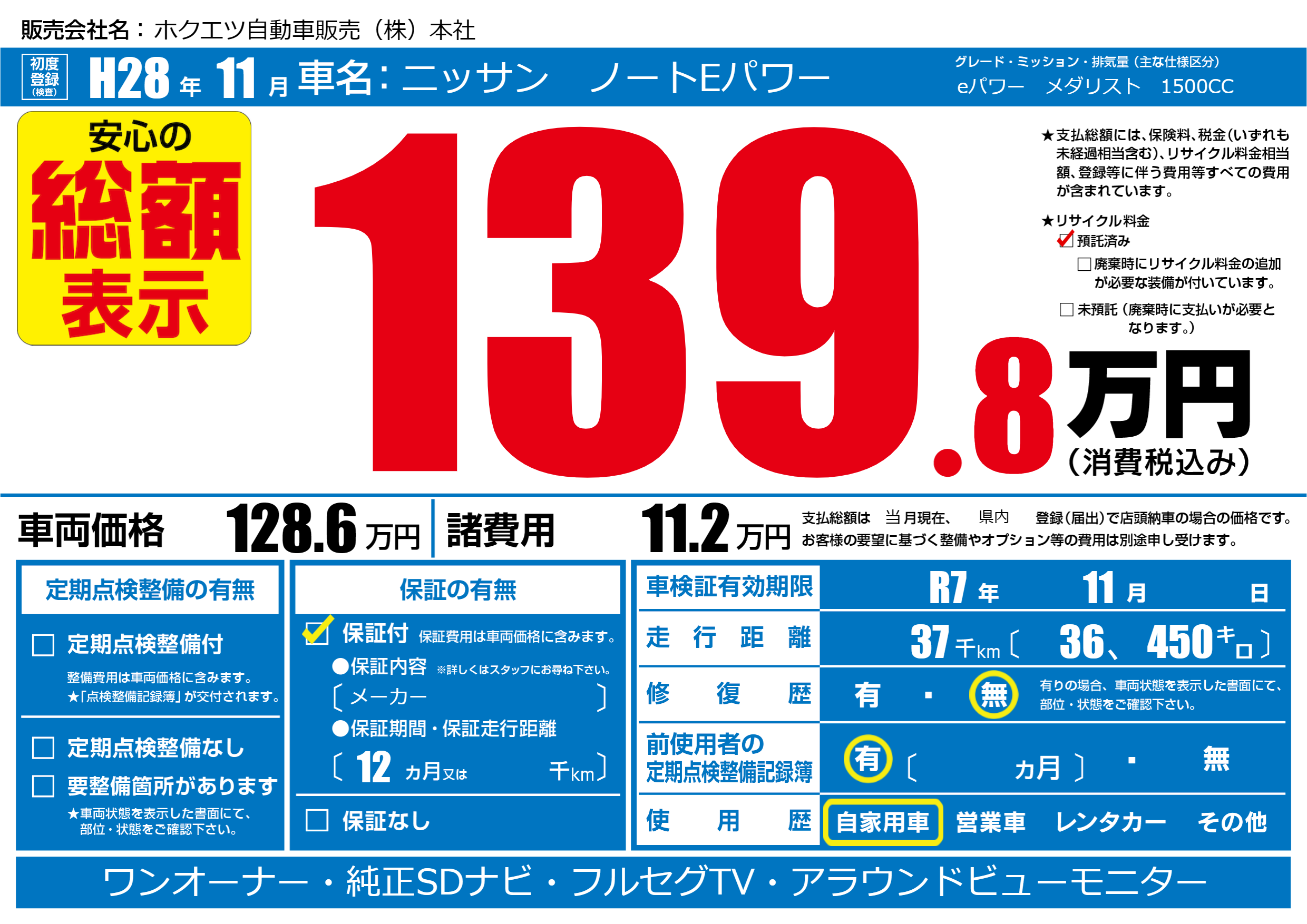 | 車名 | ニッサン ノートEパワー | グレード ミッション 排気量 |