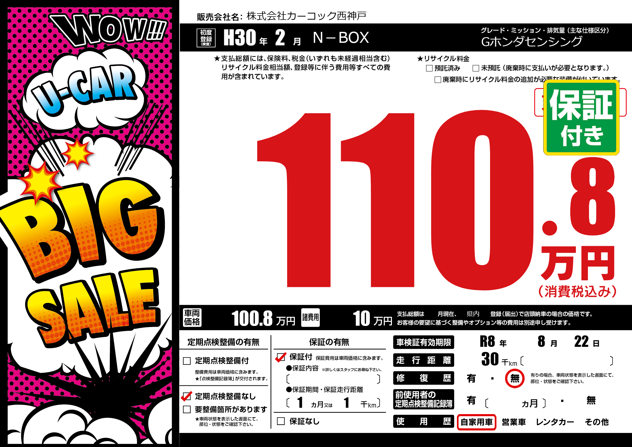 | 走行キロ | 3万km | 初年度登録 | H30年2月 |