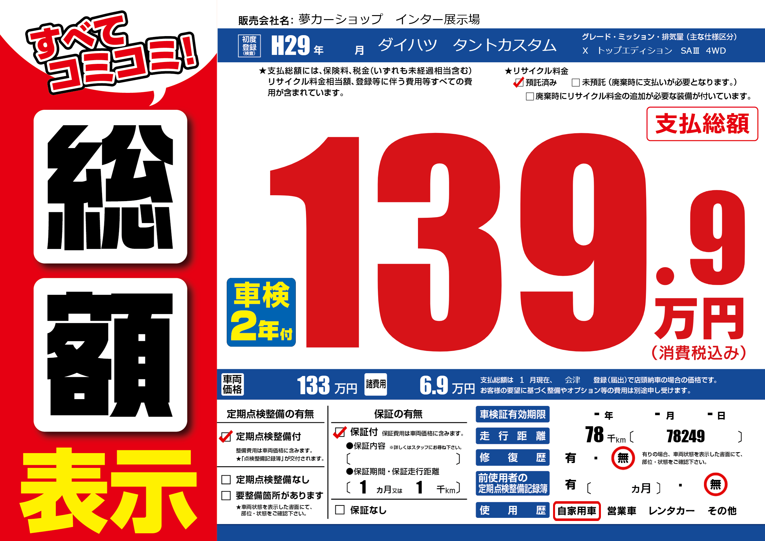 | 走行キロ | 7.8万km | 初年度登録 | H29年---月 |