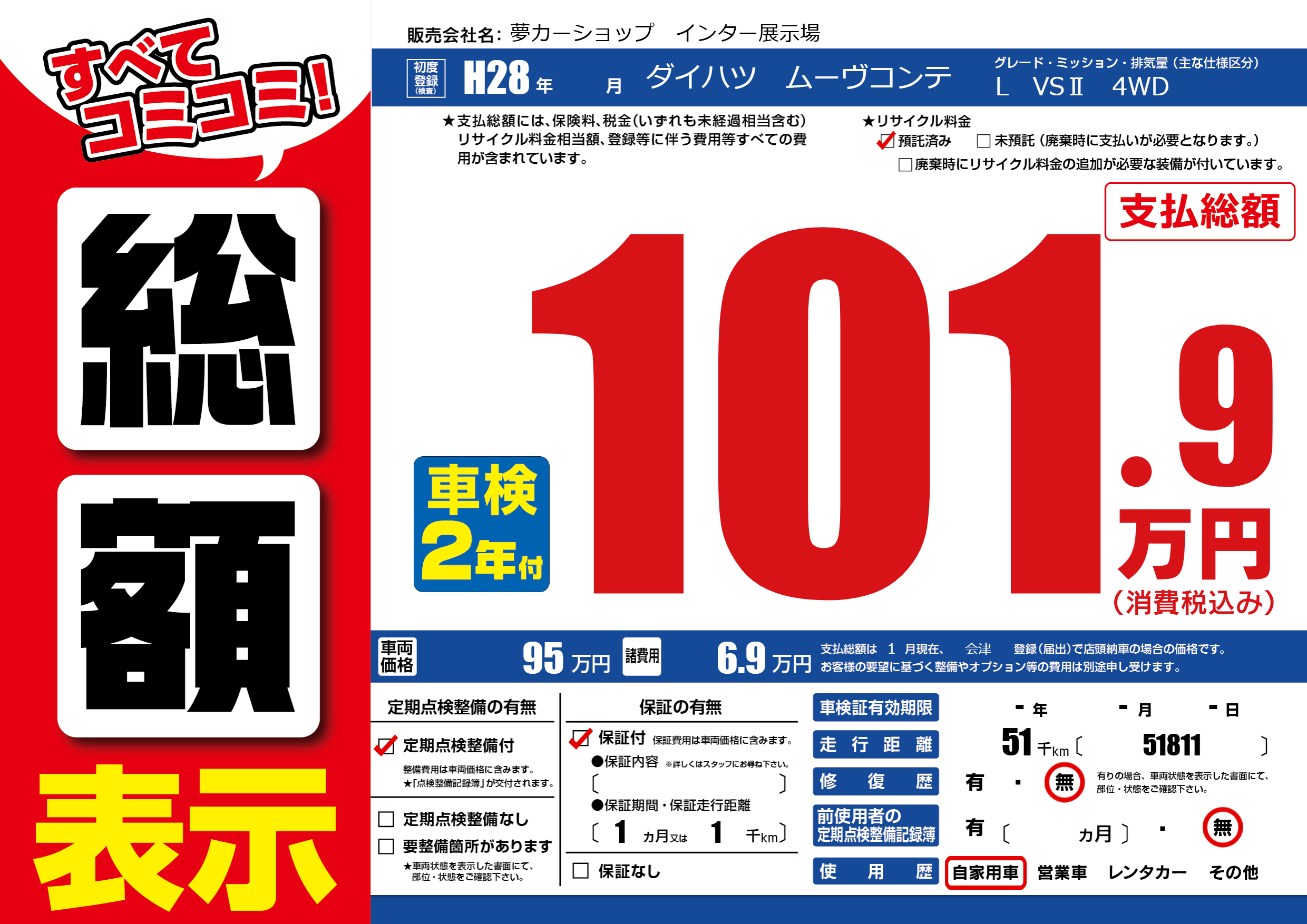 | 車名 | ダイハツ ムーヴコンテ | グレード ミッション 排気量 |