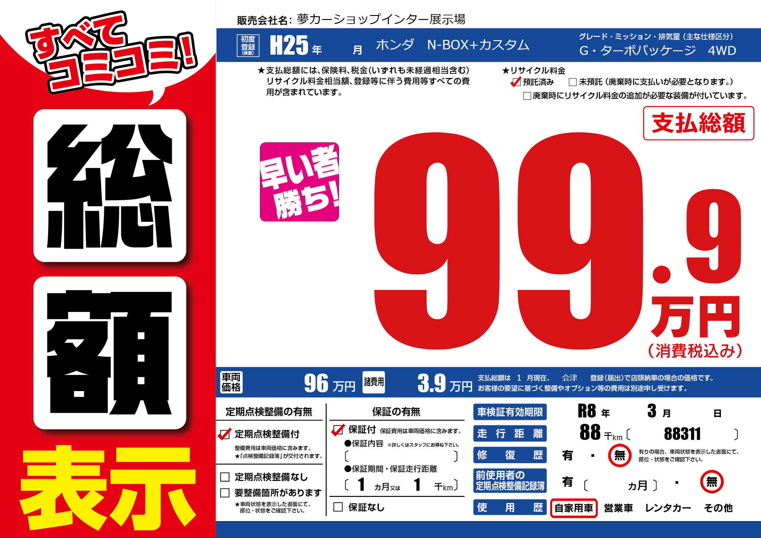 | 車名 | ホンダ N-BOX+カスタム | グレード ミッション 排気量 |