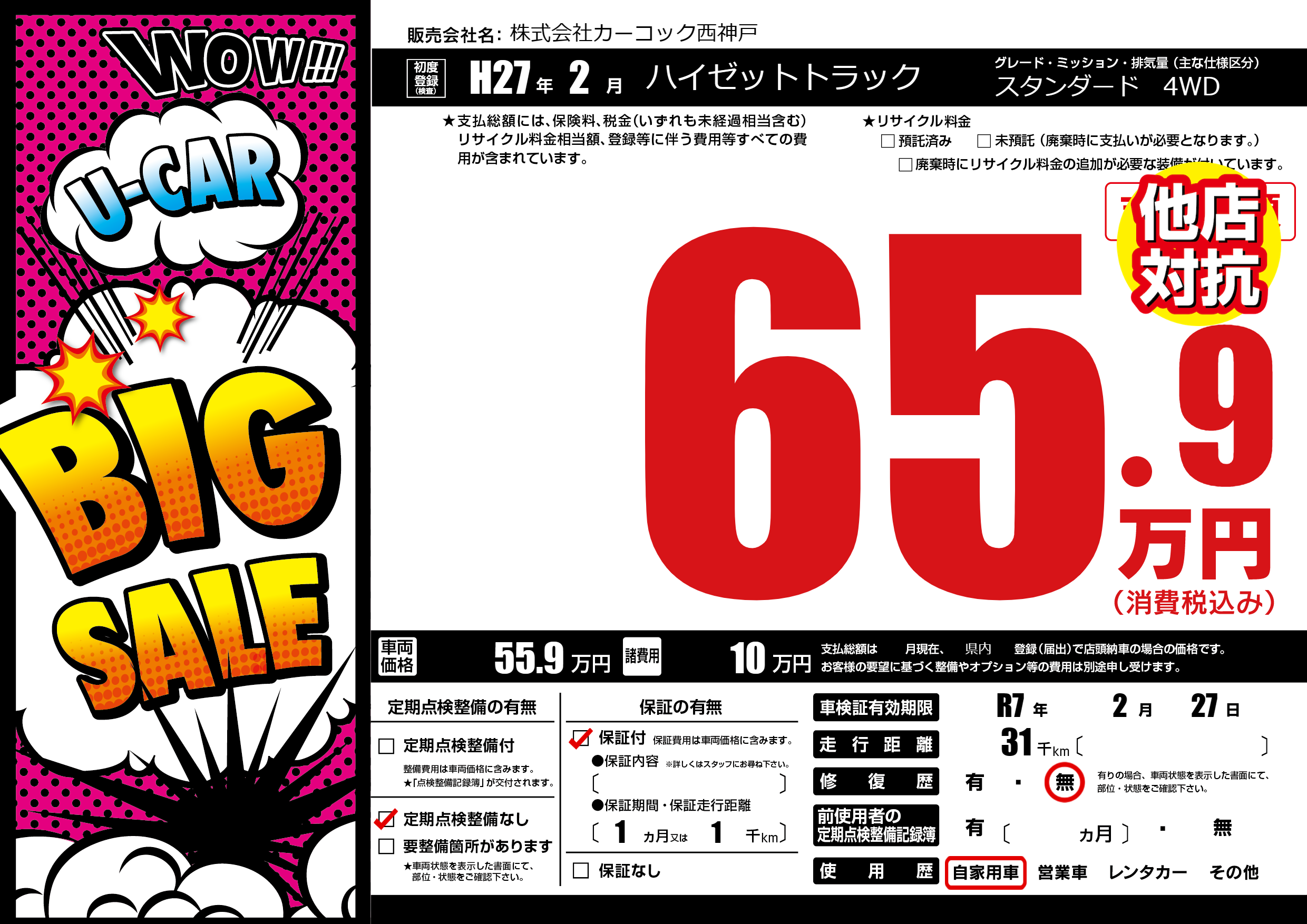 | 走行キロ | 3.1万km | 初年度登録 | H27年2月 |
