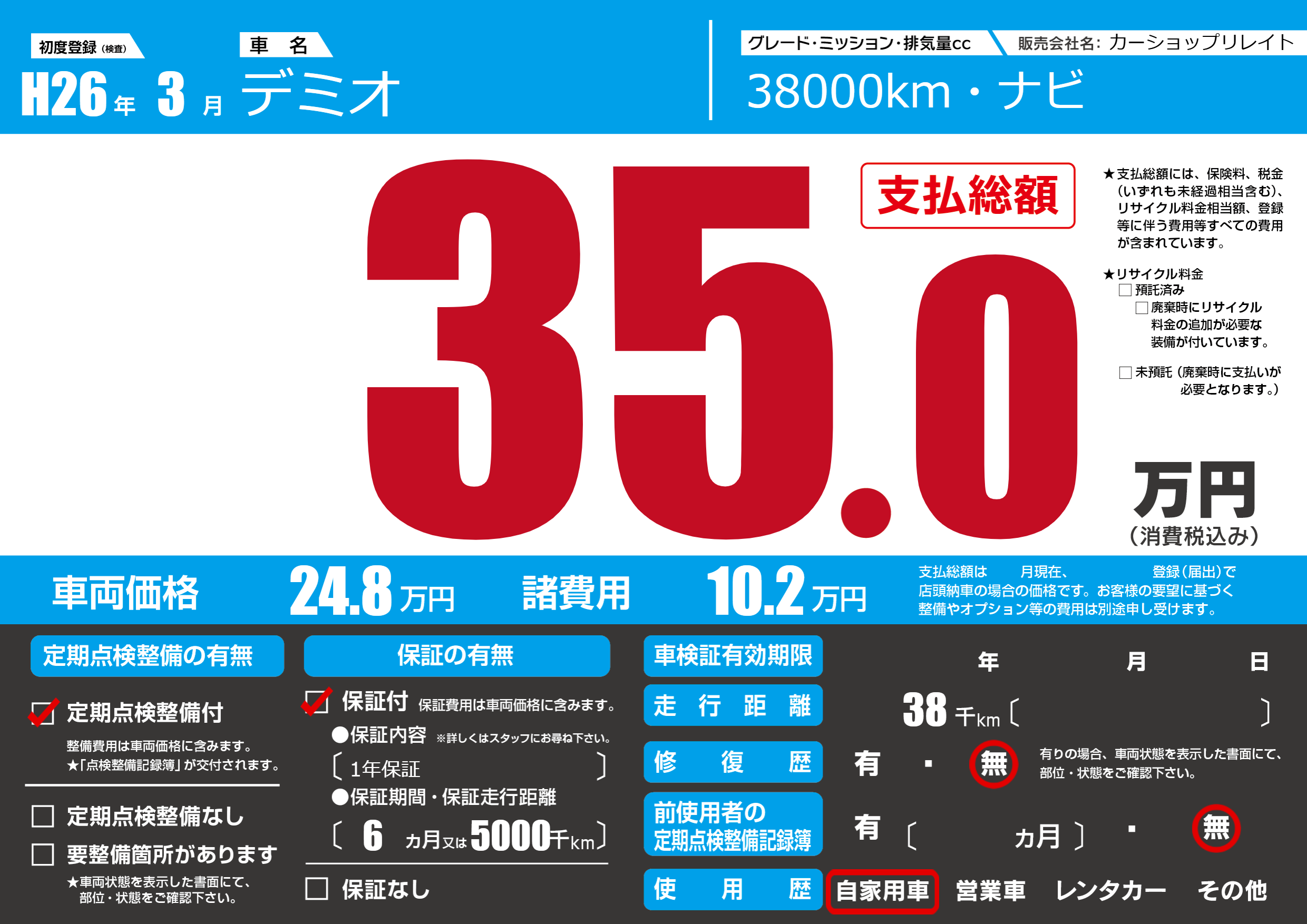 | 走行キロ | 3.8万km | 初年度登録 | H26年3月 |
