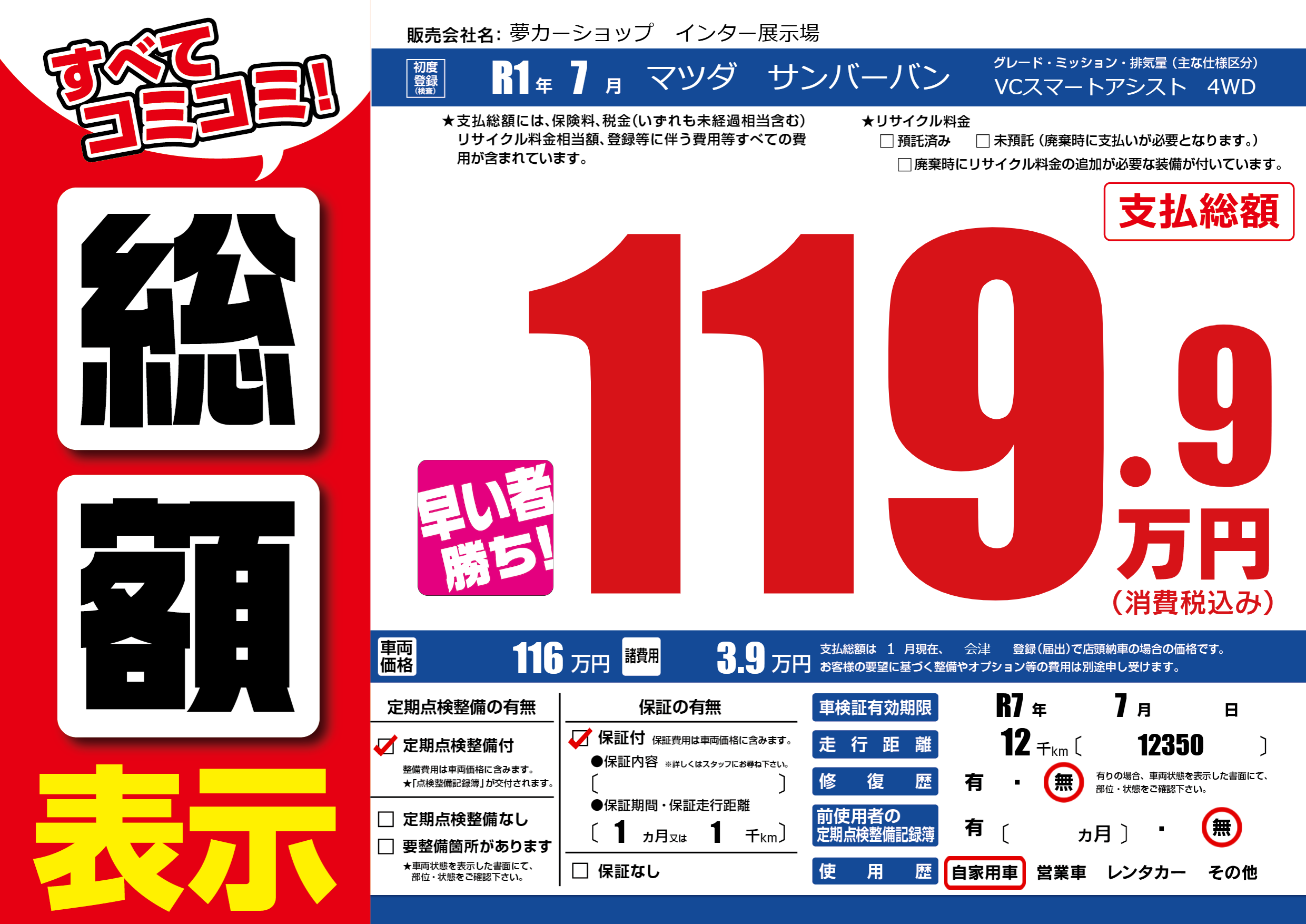 | 走行キロ | 1.2万km | 初年度登録 | R1年7月 |