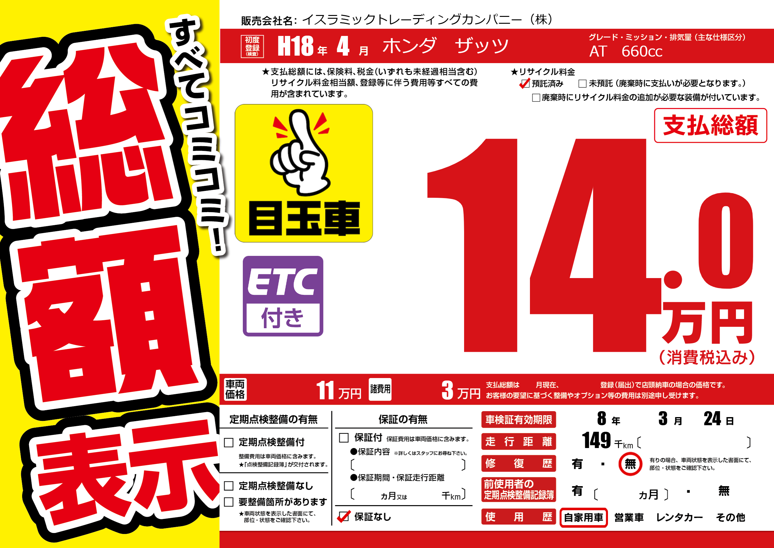 | 走行キロ | 14.9万km | 初年度登録 | H18年4月 |