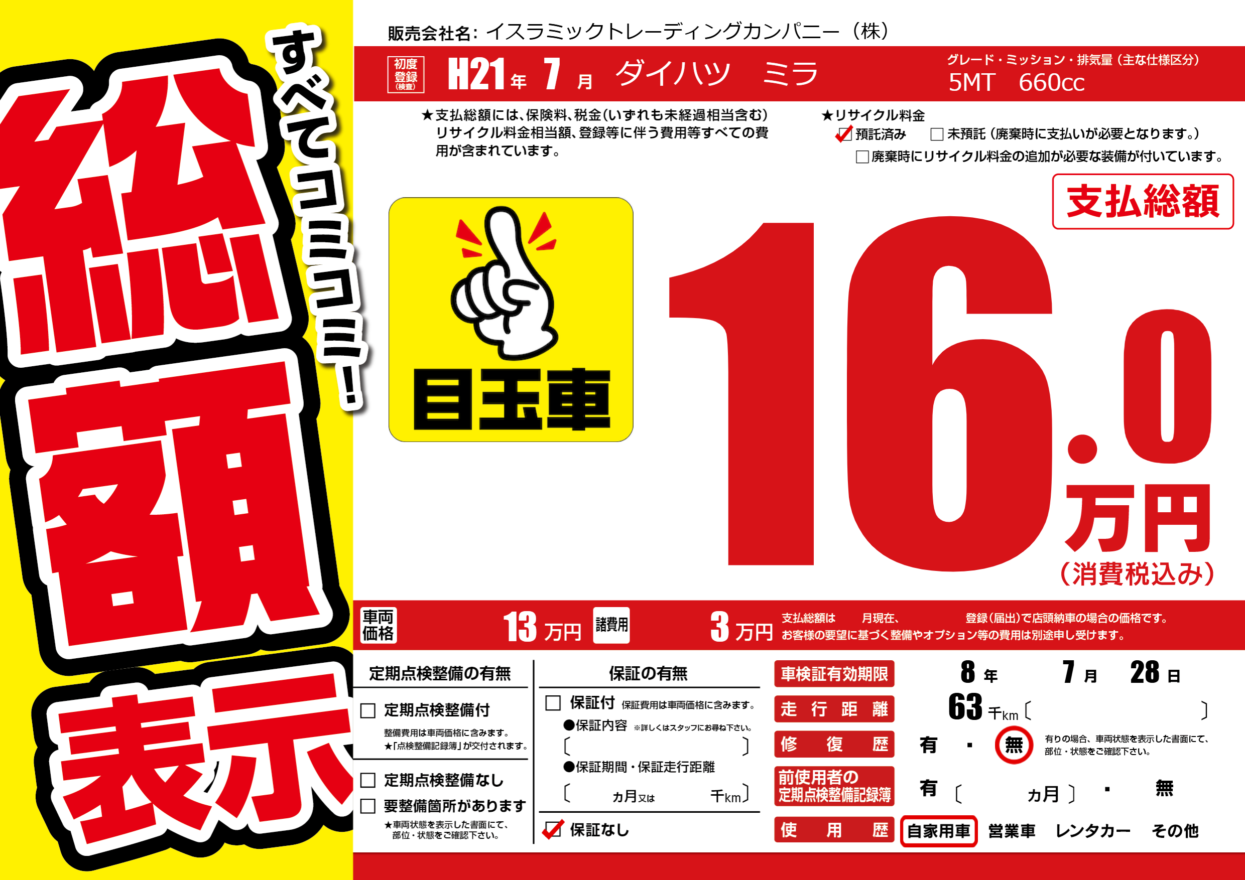 | 走行キロ | 6.3万km | 初年度登録 | H21年7月 |