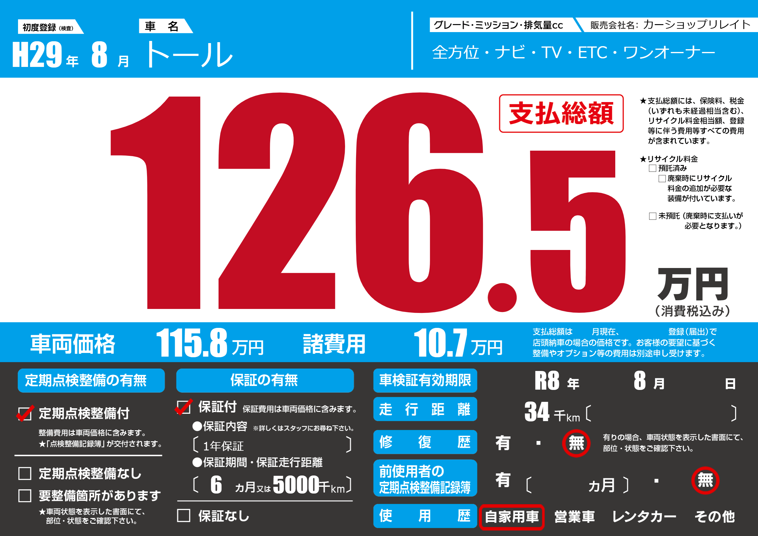 | 走行キロ | 3.4万km | 初年度登録 | H29年8月 |