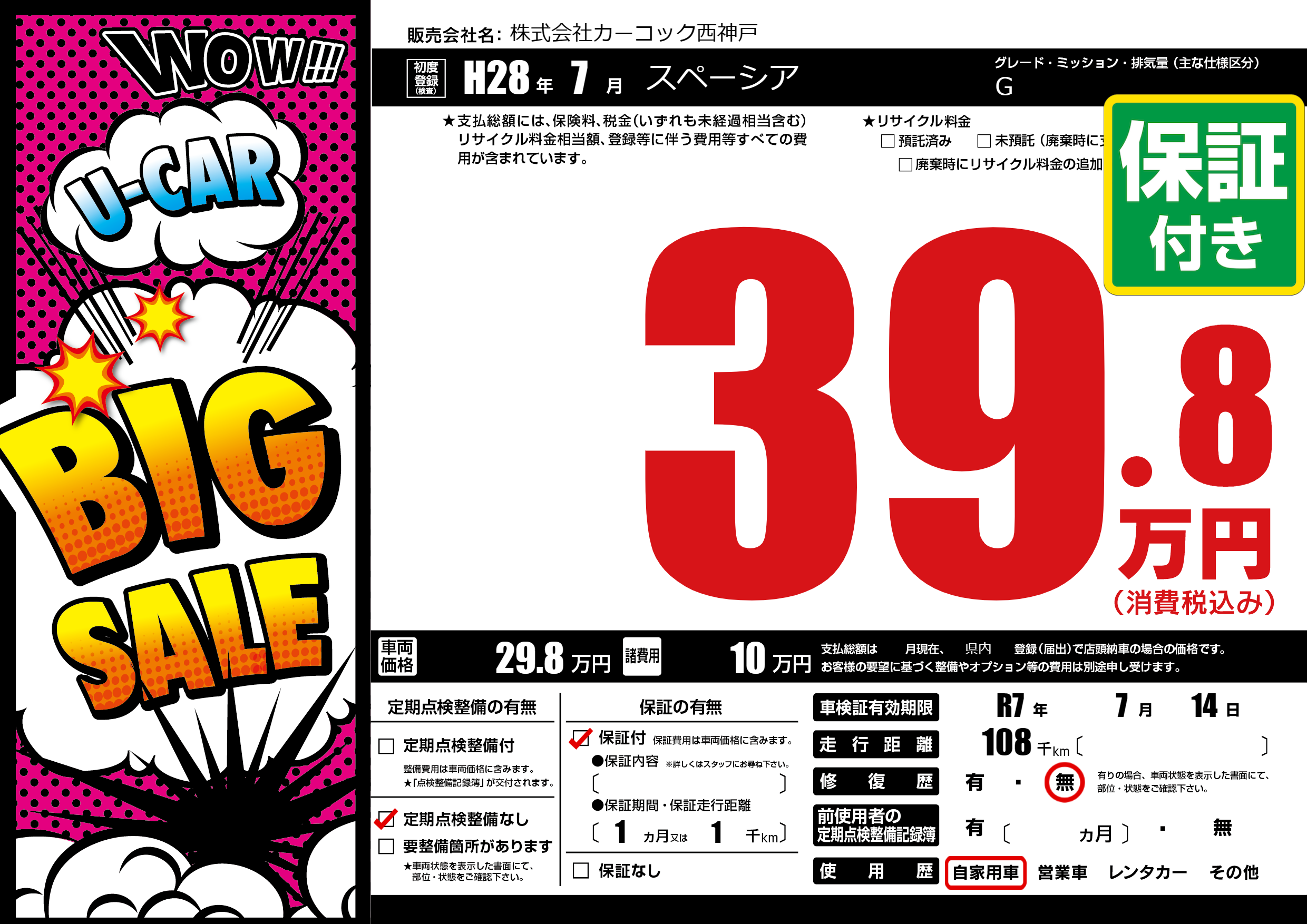| 走行キロ | 10.8万km | 初年度登録 | H28年7月 |