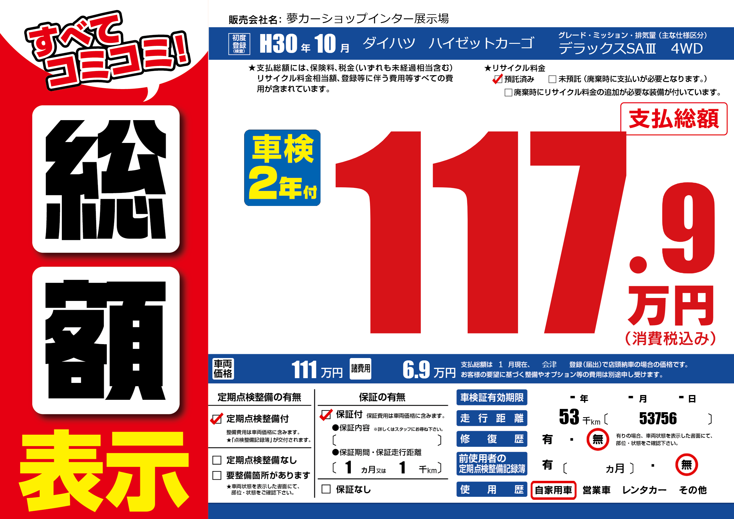 | 車名 | ダイハツ ハイゼットカーゴ | グレード ミッション 排気量 |