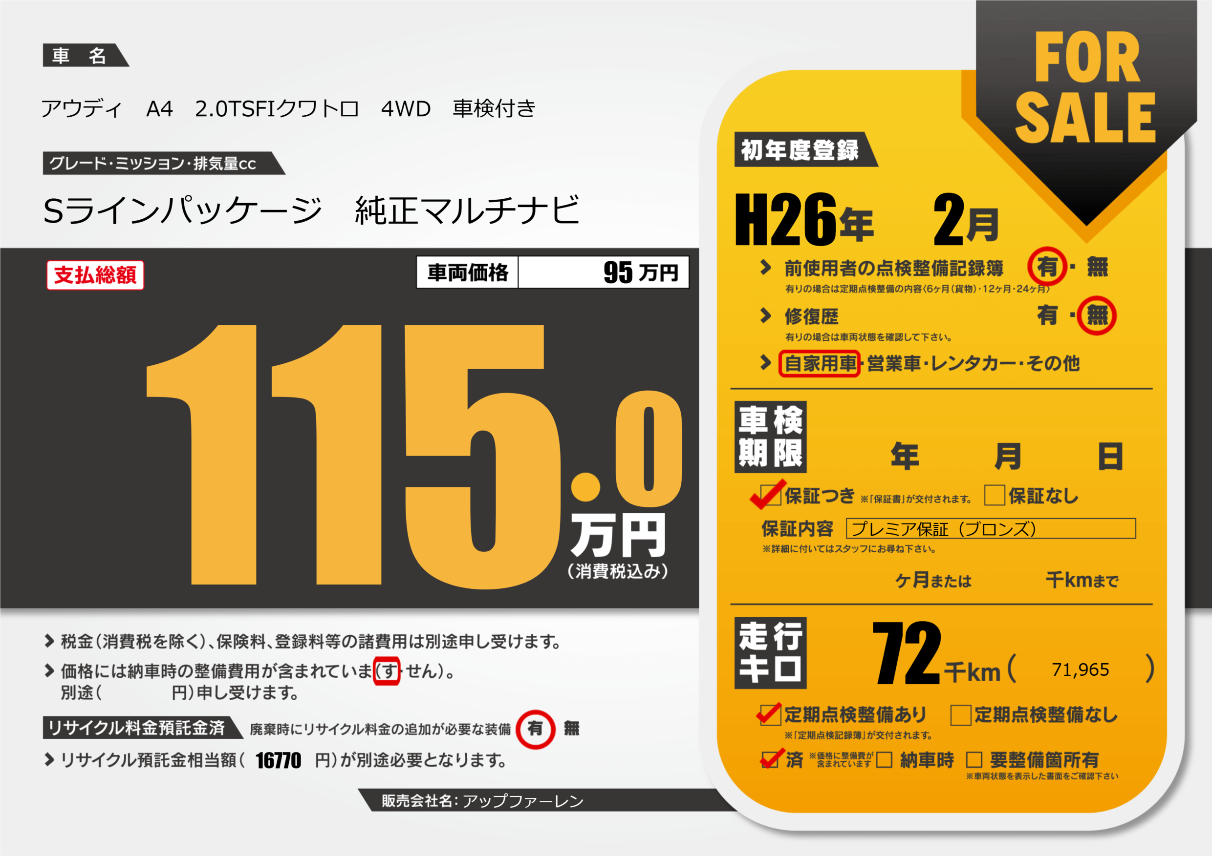 | 車名 | アウディ A4 2.0TSFIクワトロ 4WD 車検付き | グレード ミッション 排気量 |