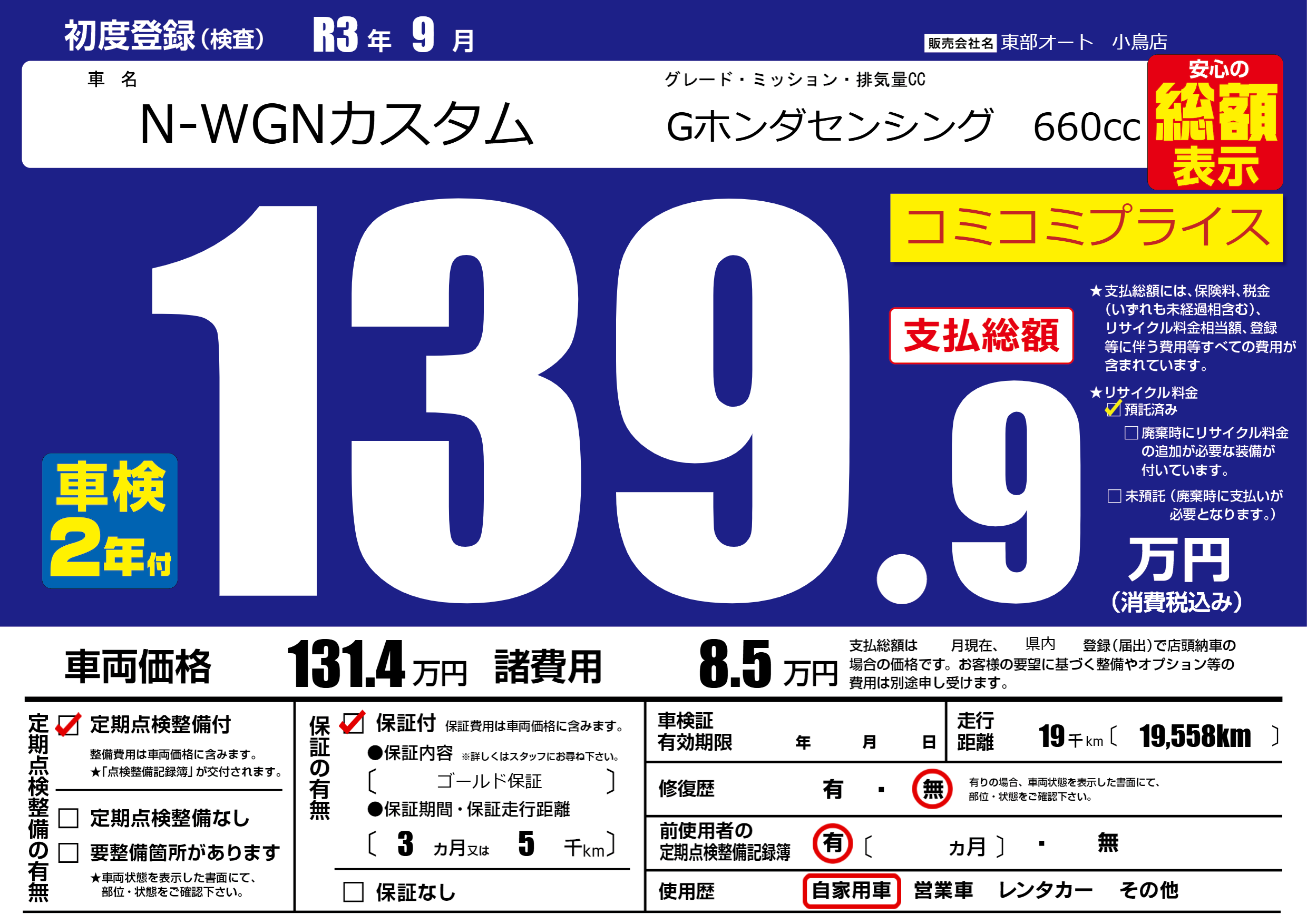 | 車名 | N-WGNカスタム | グレード ミッション 排気量 |
