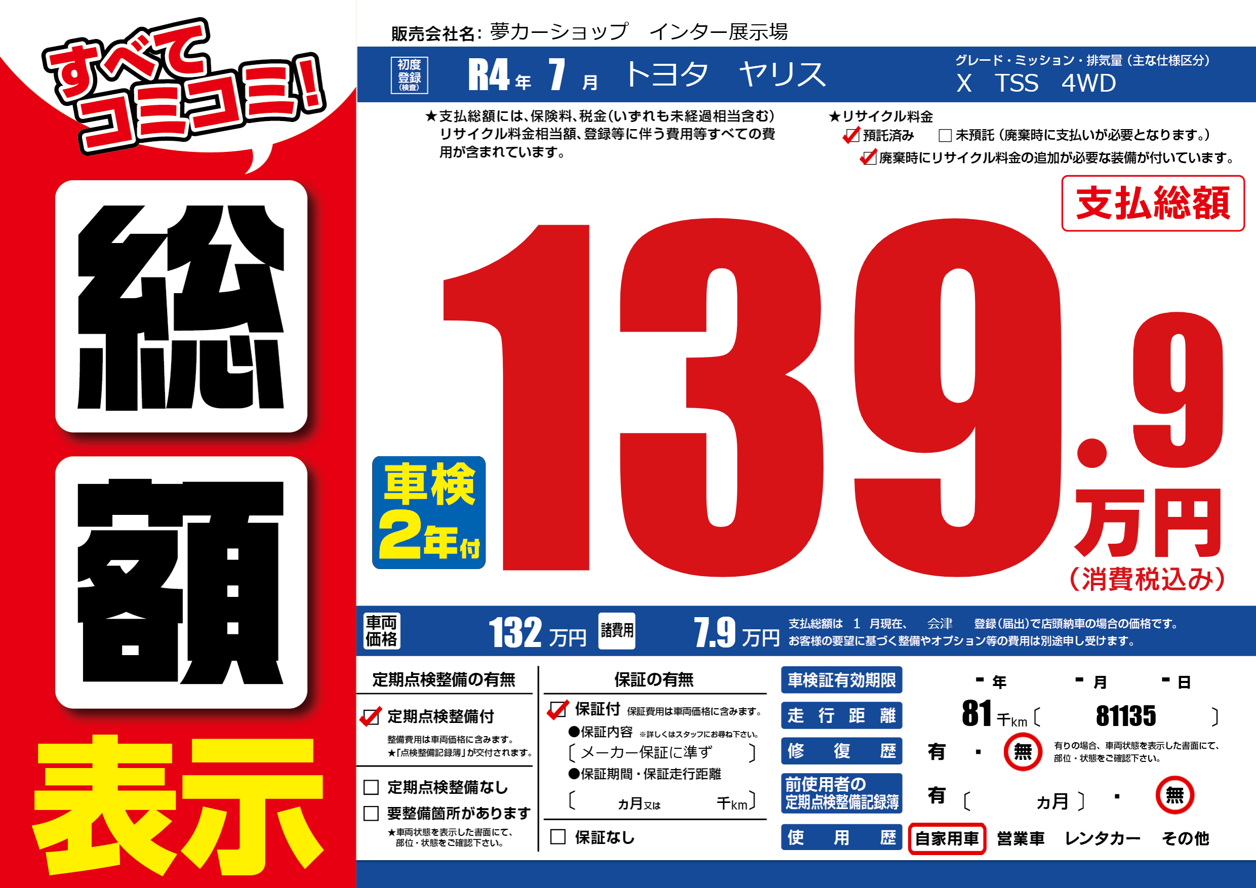 保証付き 保証内容(メーカー保証に準ず) ヶ月または千km |