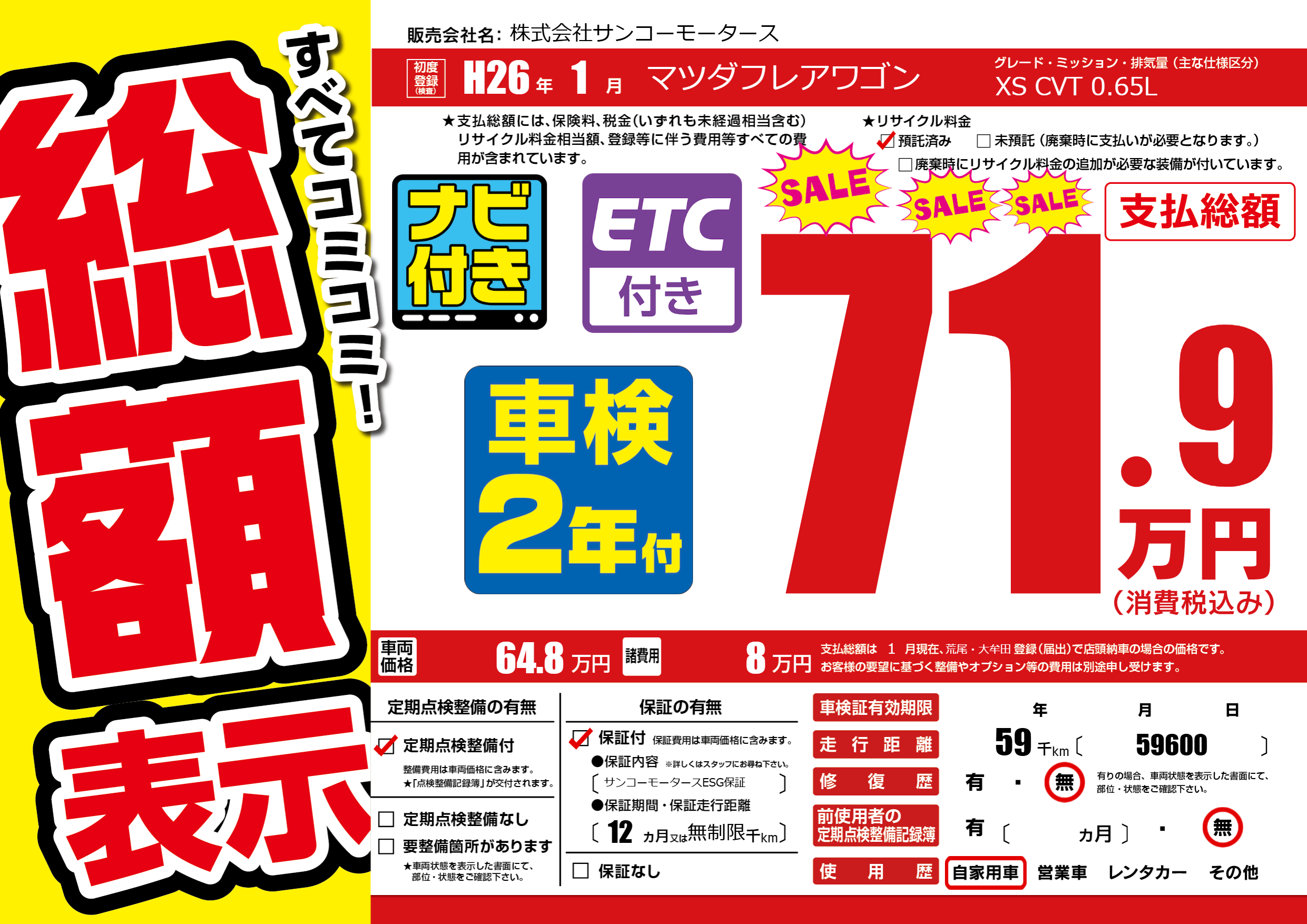 保証付き 保証内容(サンコーモータースESG保証) 12ヶ月または無制限千km |