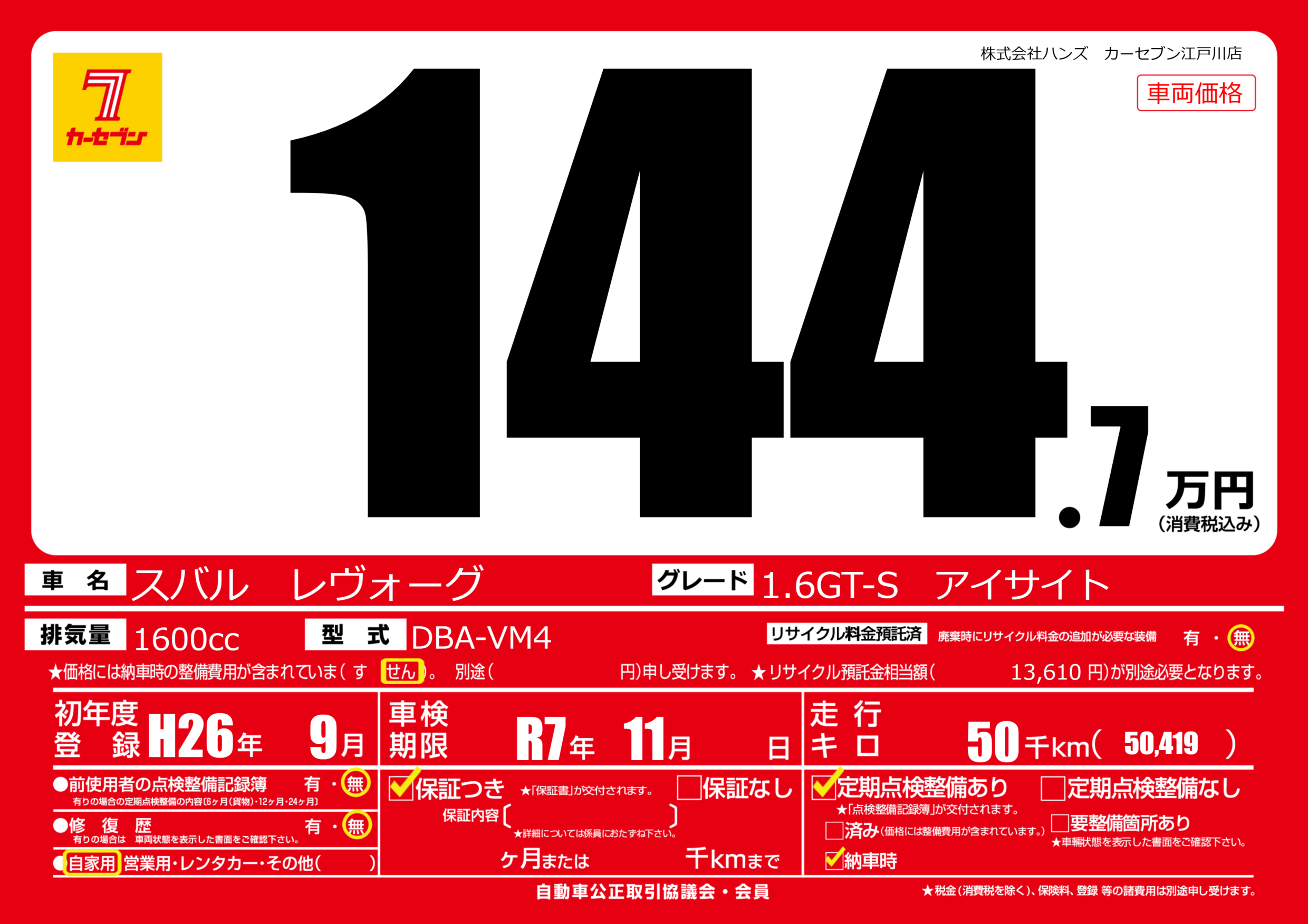 | 車名 | スバル レヴォーグ | グレード ミッション 排気量 |