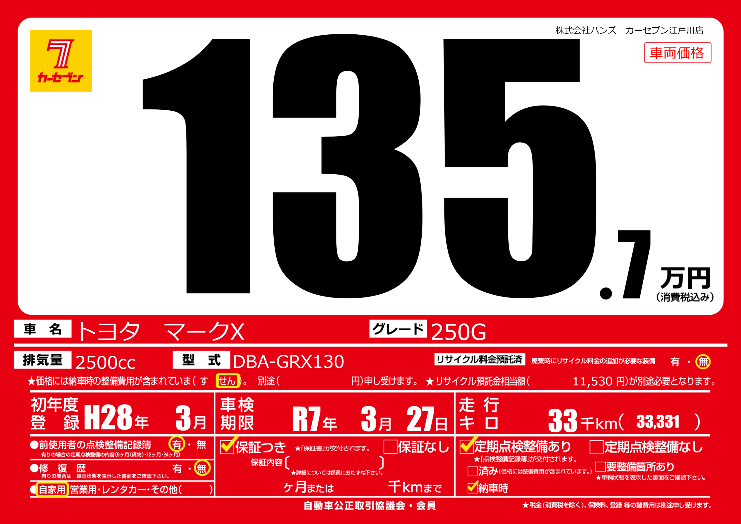 | 車検制限 | R7年 3月 27日 | ||
