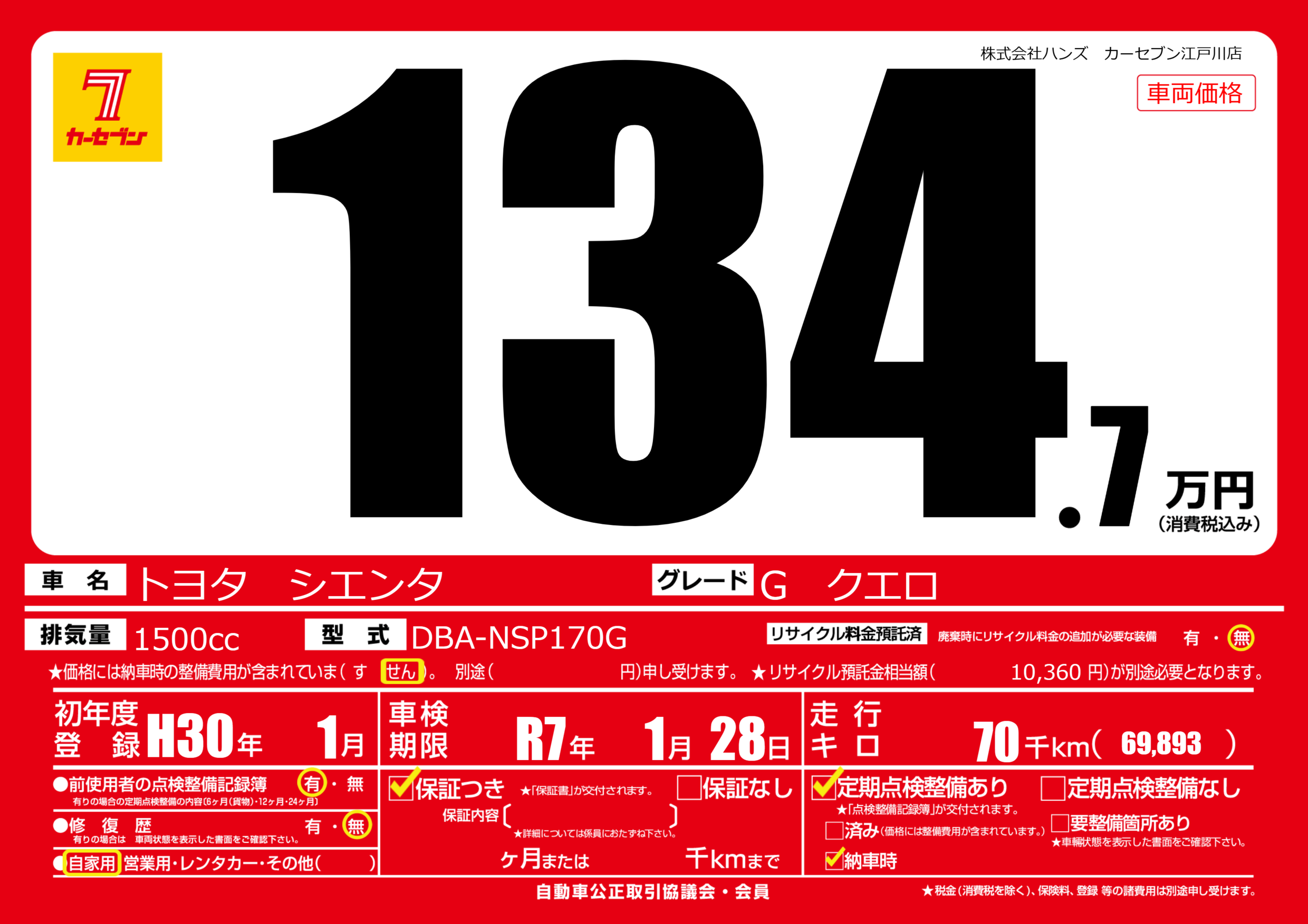 なし | 車検制限 | R7年1月28月 |