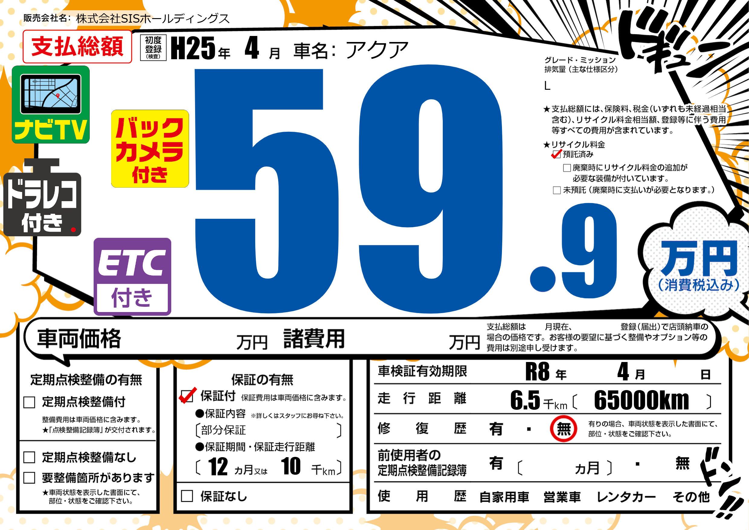 | 走行キロ | 0.6万km | 初年度登録 | H25年4月 |