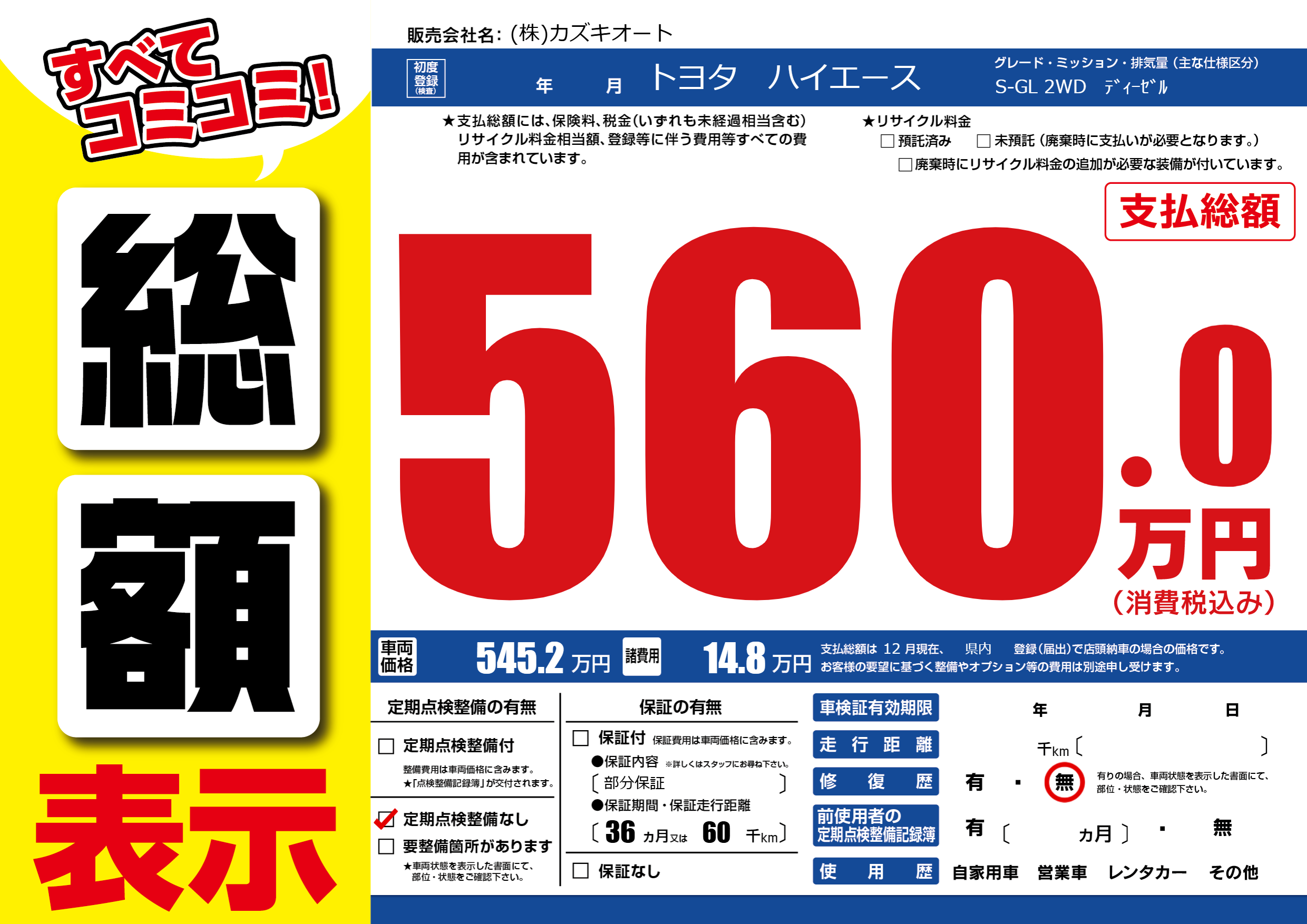 | 車名 | トヨタ ハイエース | グレード ミッション 排気量 |