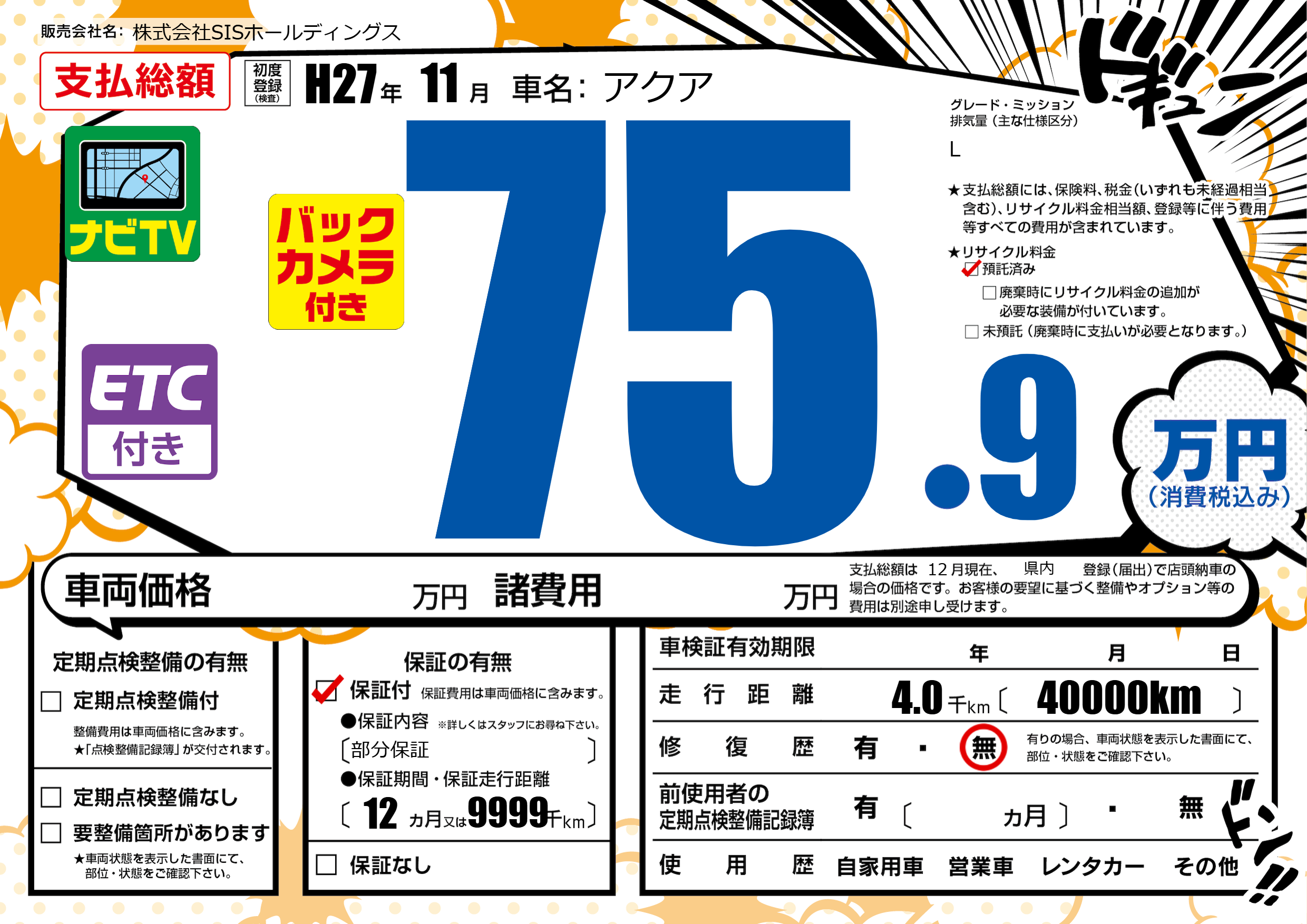 | 走行キロ | 0.4万km | 初年度登録 | H27年11月 |