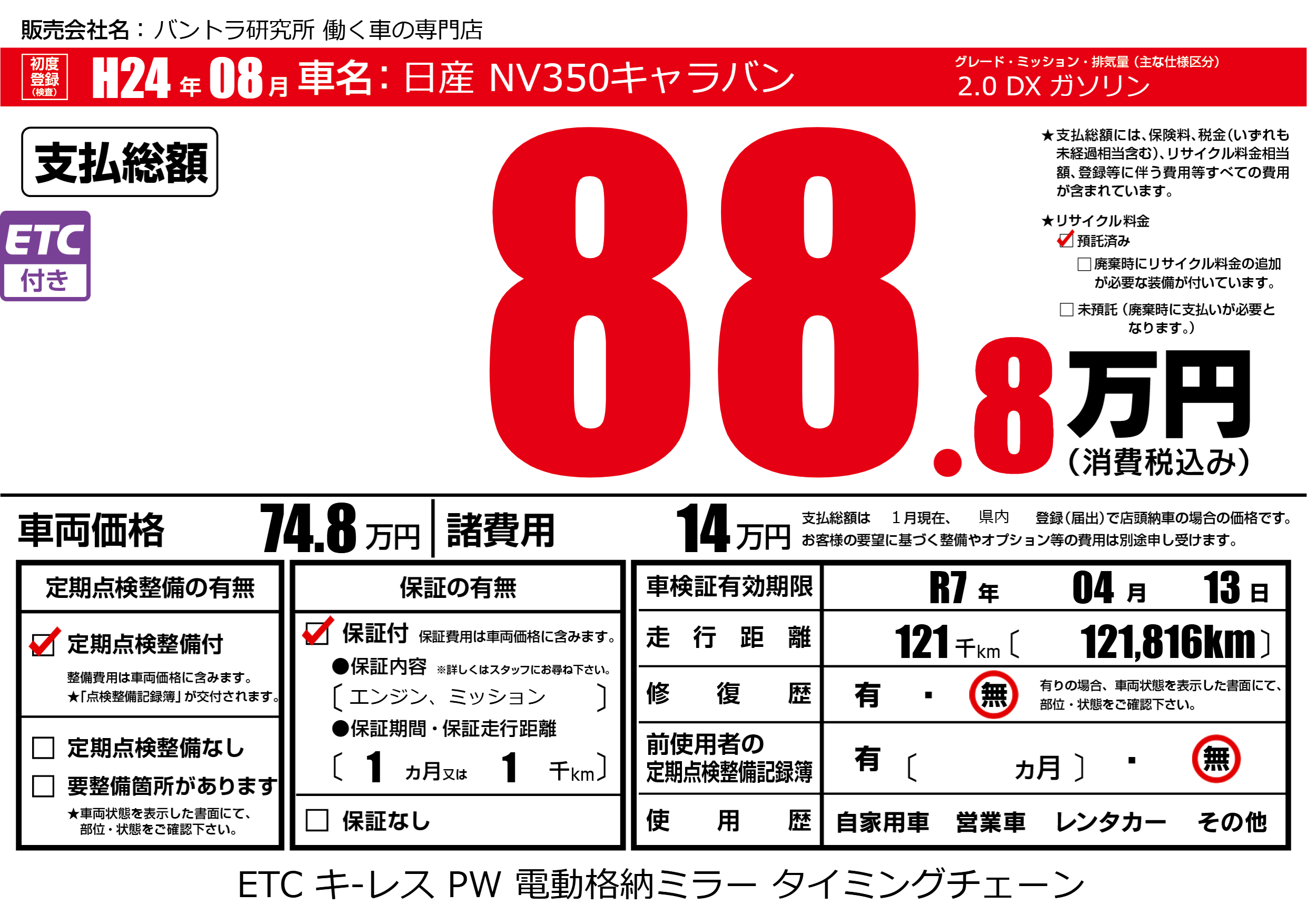 | 車名 | 日産 NV350キャラバン | グレード ミッション 排気量 |