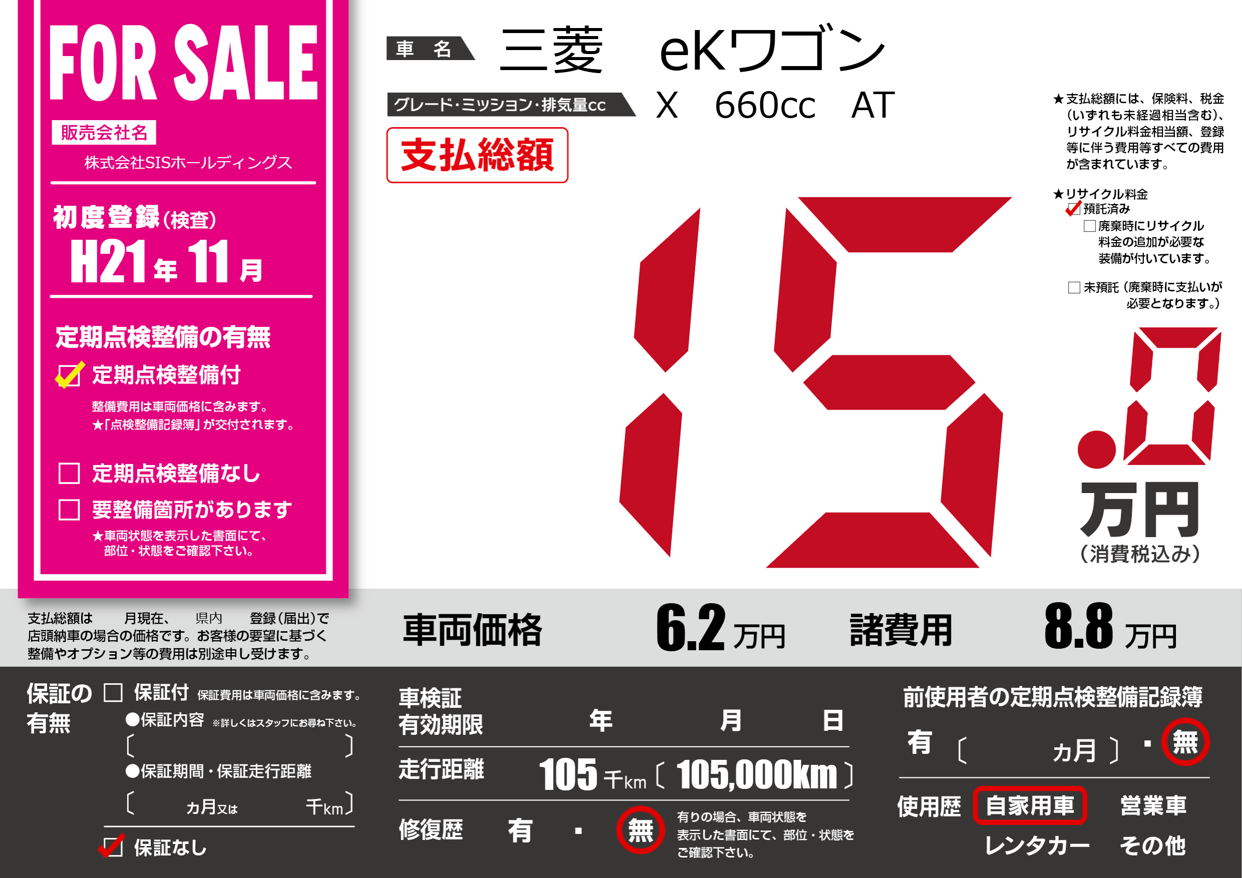 | 走行キロ | 10.5万km | 初年度登録 | H21年11月 |