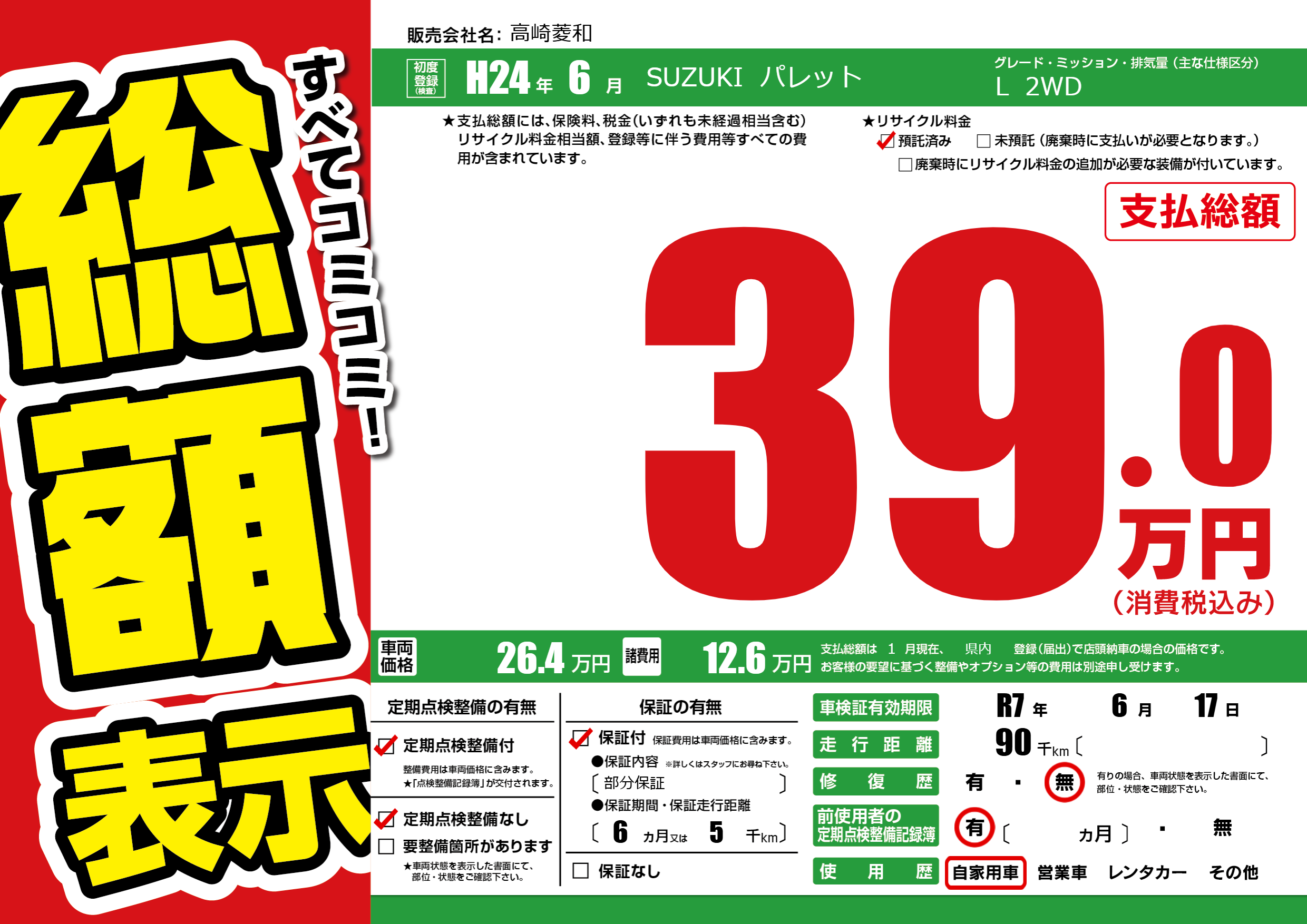 | 走行キロ | 9万km | 初年度登録 | H24年6月 |