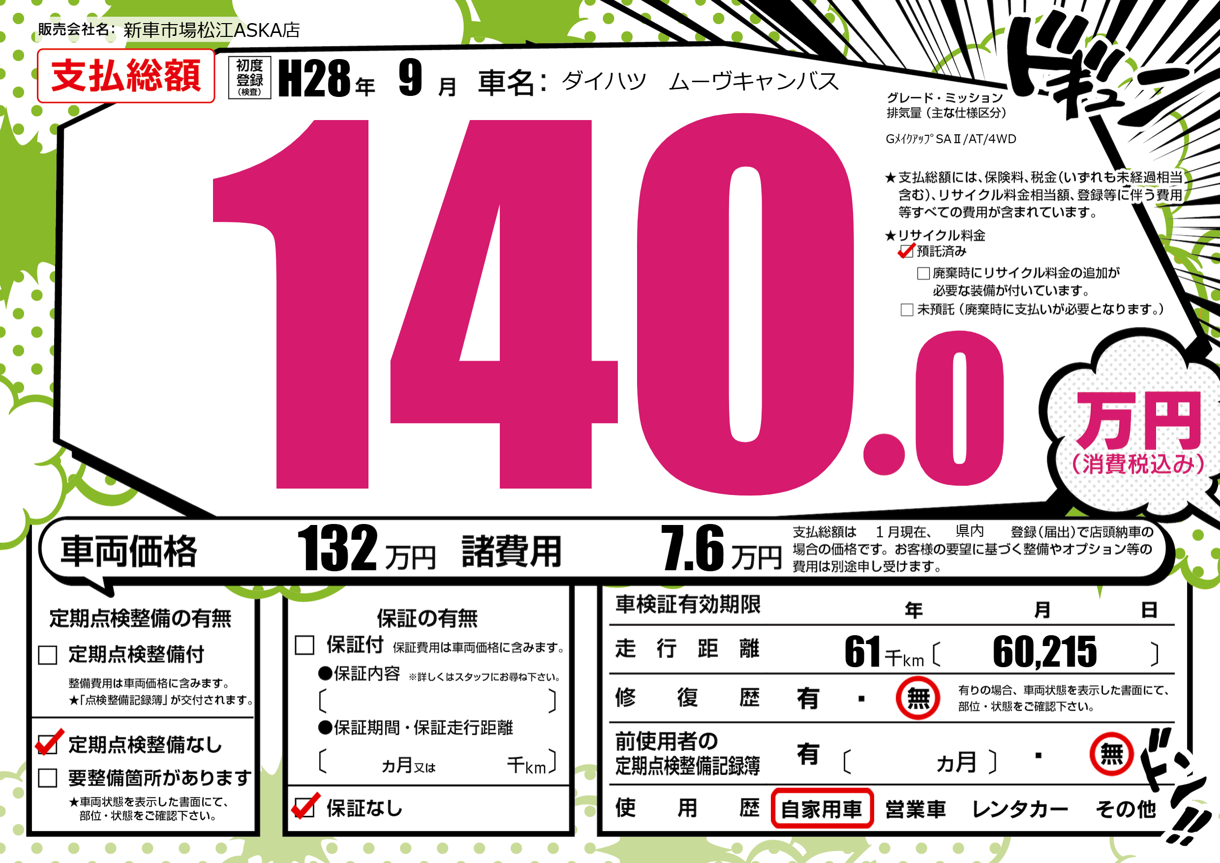 | 車名 | ダイハツ ムーヴキャンバス | グレード ミッション 排気量 |