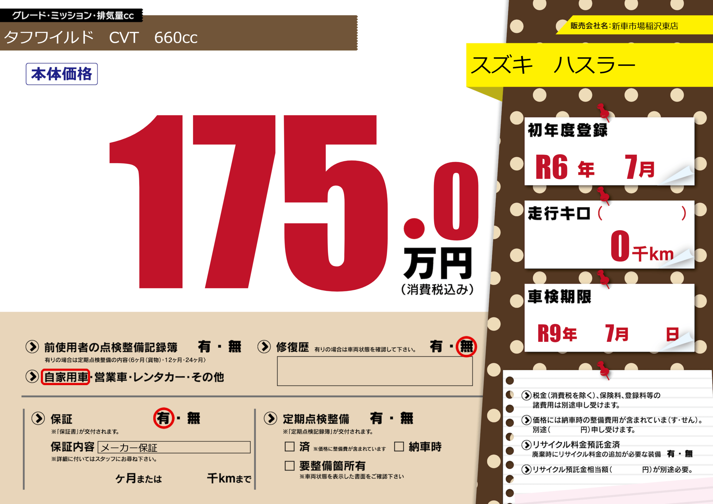 | 車名 | スズキ ハスラー | グレード ミッション 排気量 |