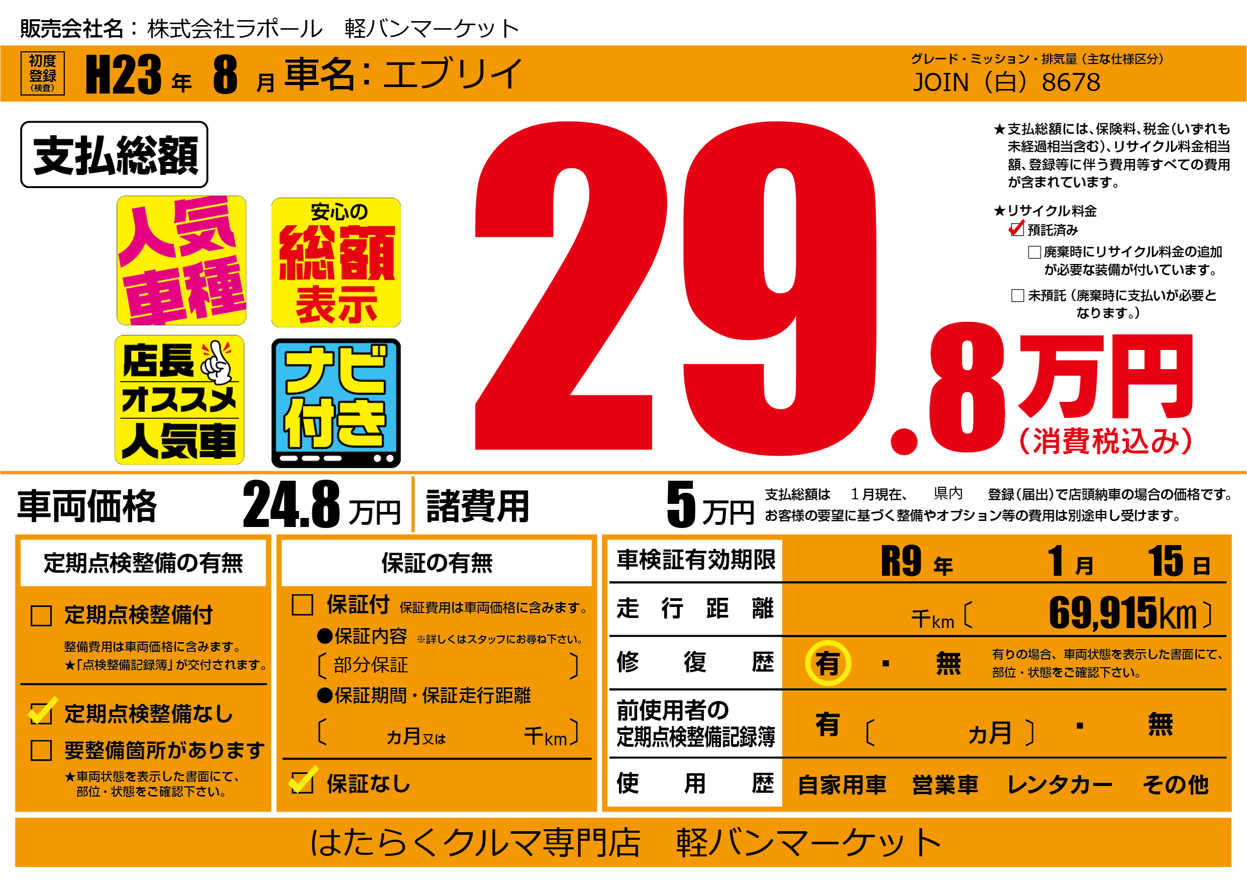 | 走行キロ | - | 初年度登録 | H23年8月 |