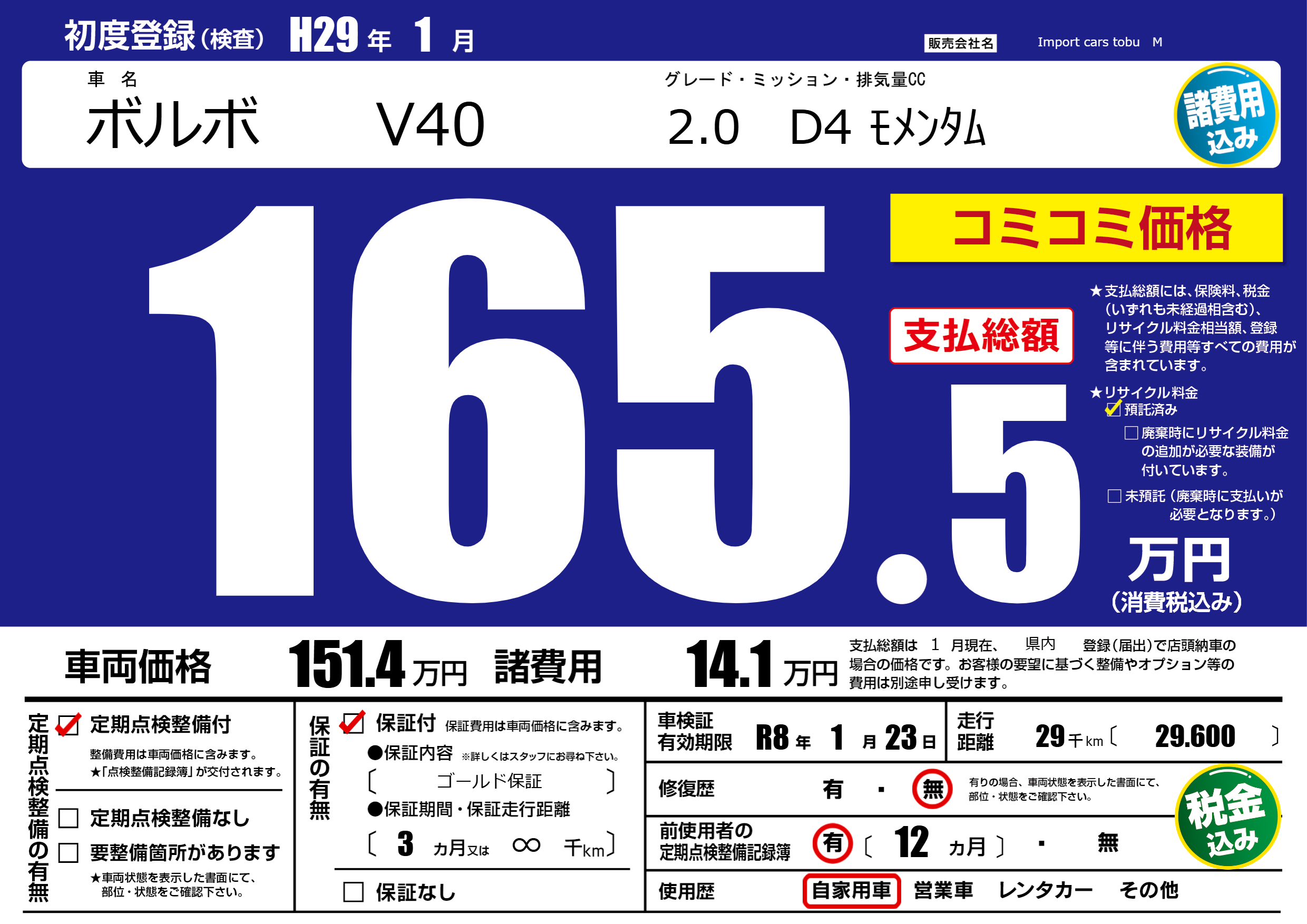 | 車名 | ボルボ V40 | グレード ミッション 排気量 |