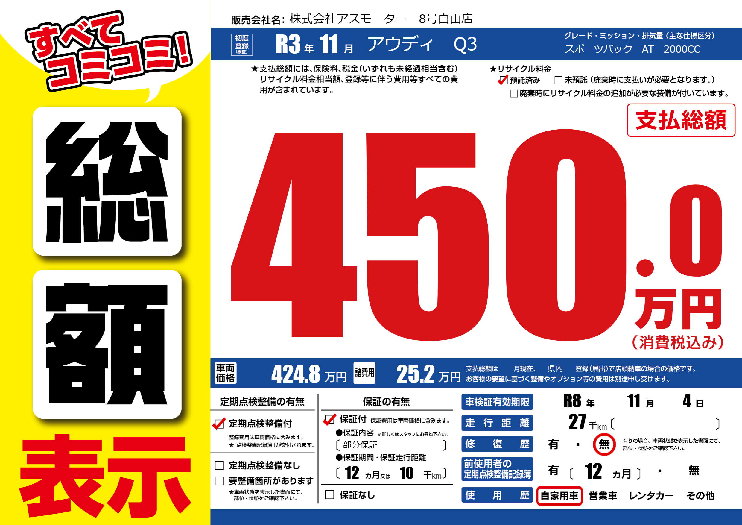 | 車名 | アウディ Q3 | グレード ミッション 排気量 |