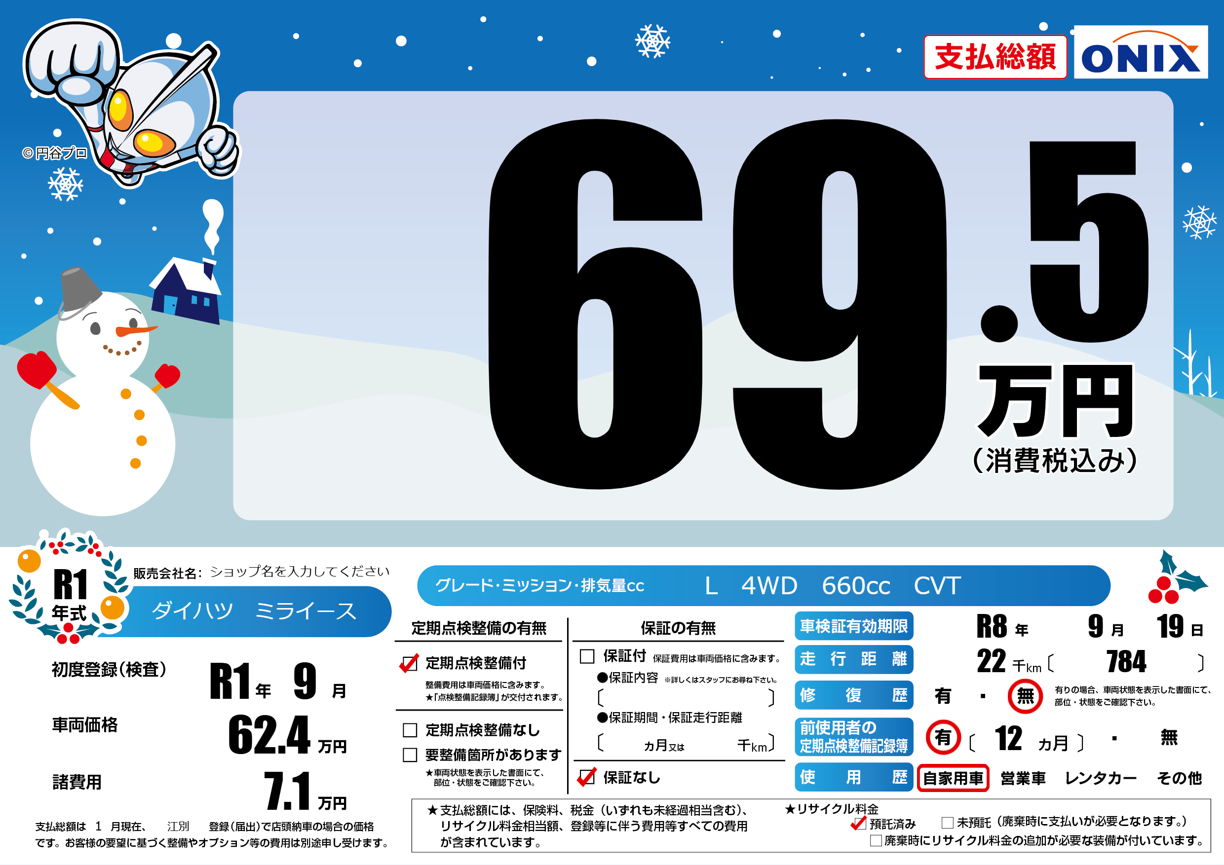 | 走行キロ | 2.2万km | 初年度登録 | R1年9月 |