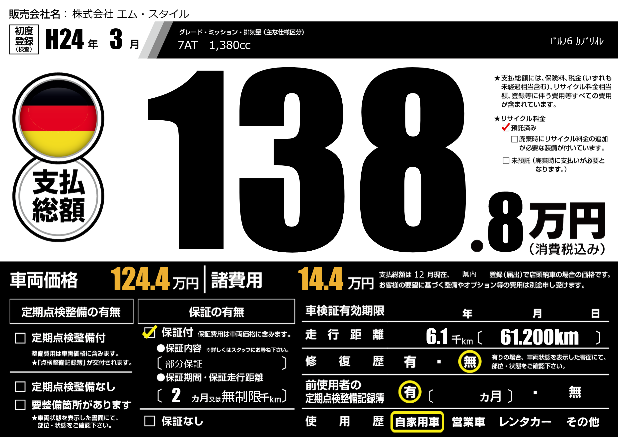 | 走行キロ | 0.6万km | 初年度登録 | H24年3月 |