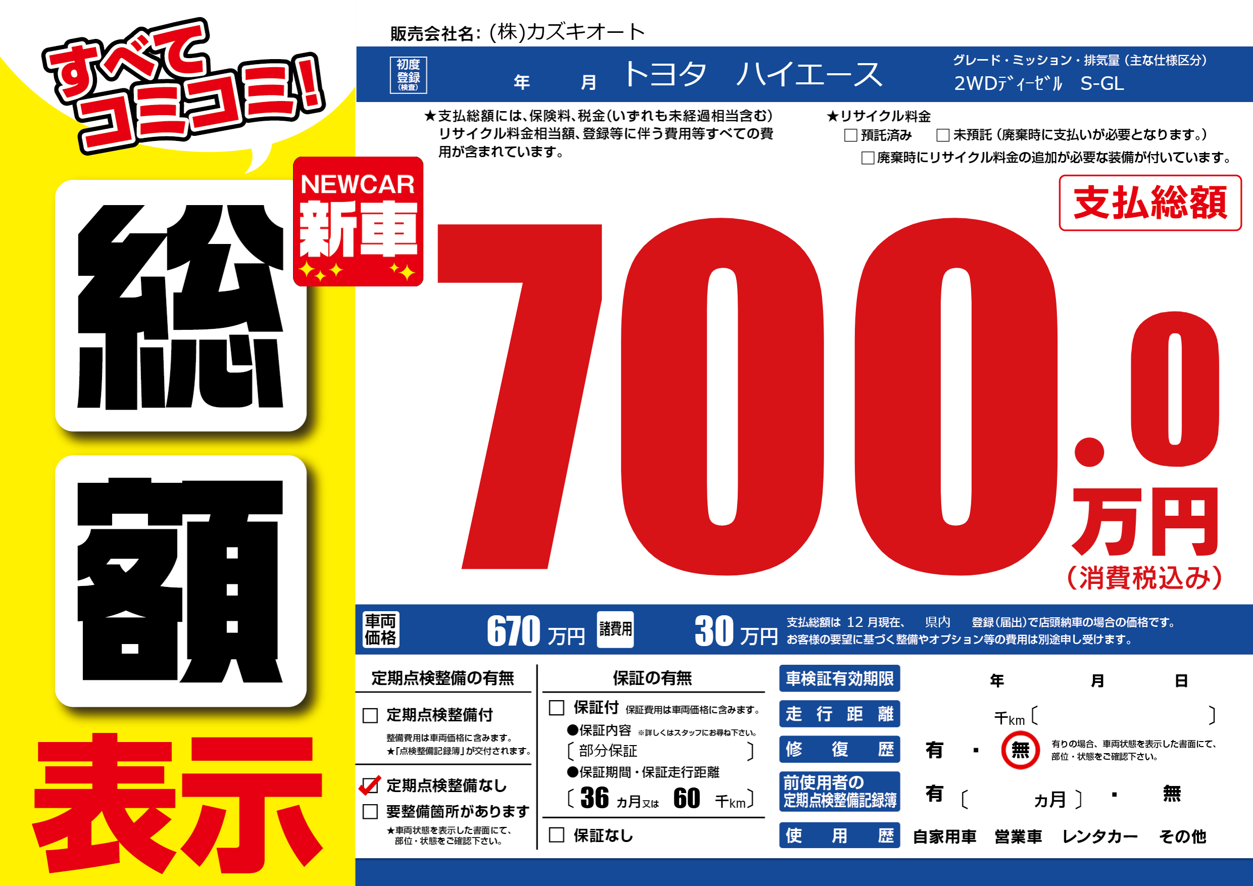 保証なし 保証内容(部分保証) 36ヶ月または(60)千kmまで |