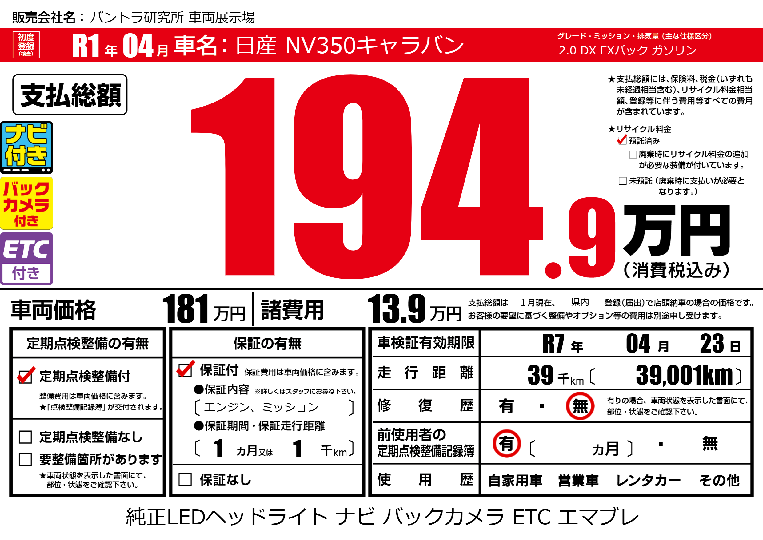 | 車名 | 日産 NV350キャラバン | グレード ミッション 排気量 |