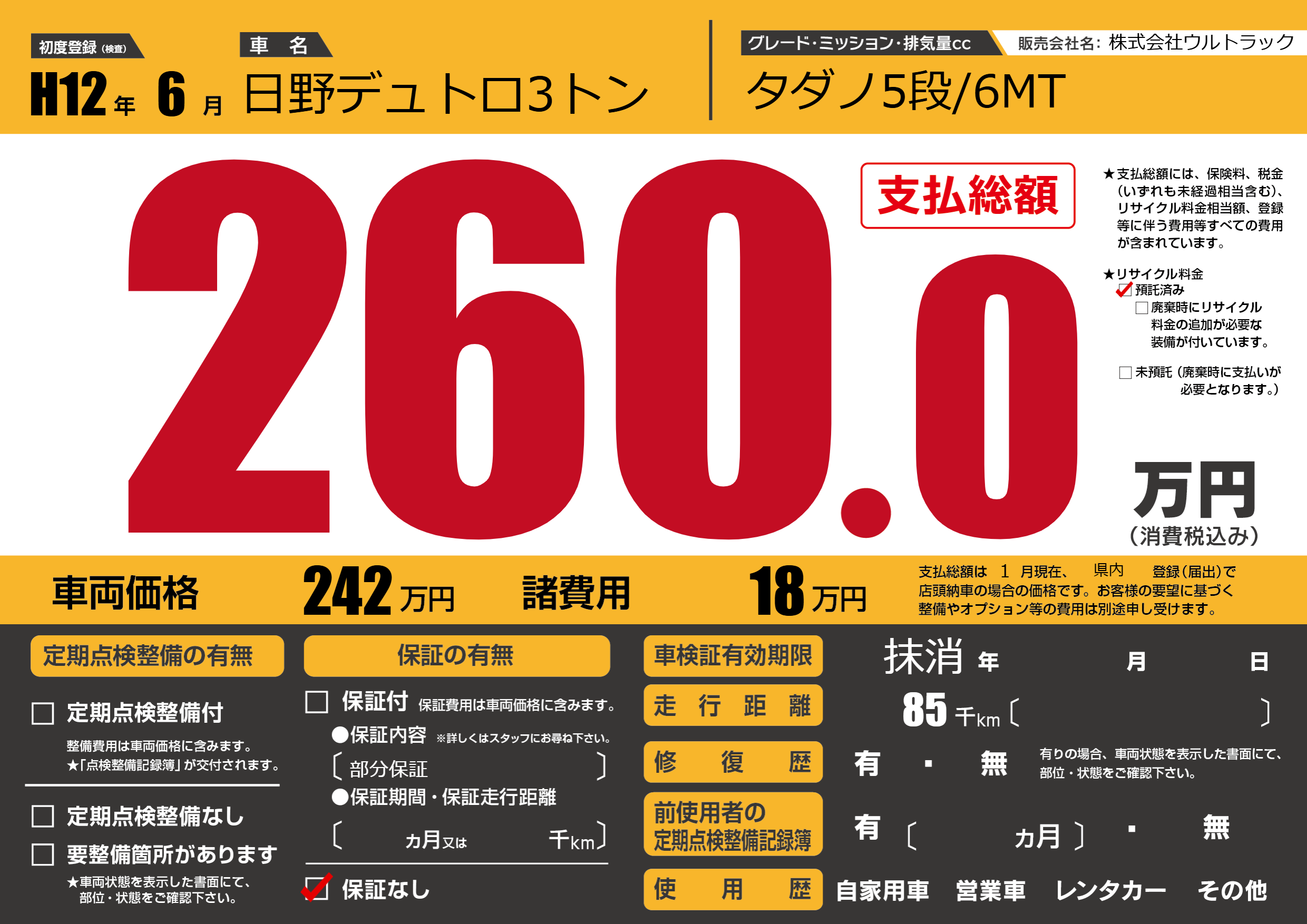 | 走行キロ | 8.5万km | 初年度登録 | H12年6月 |