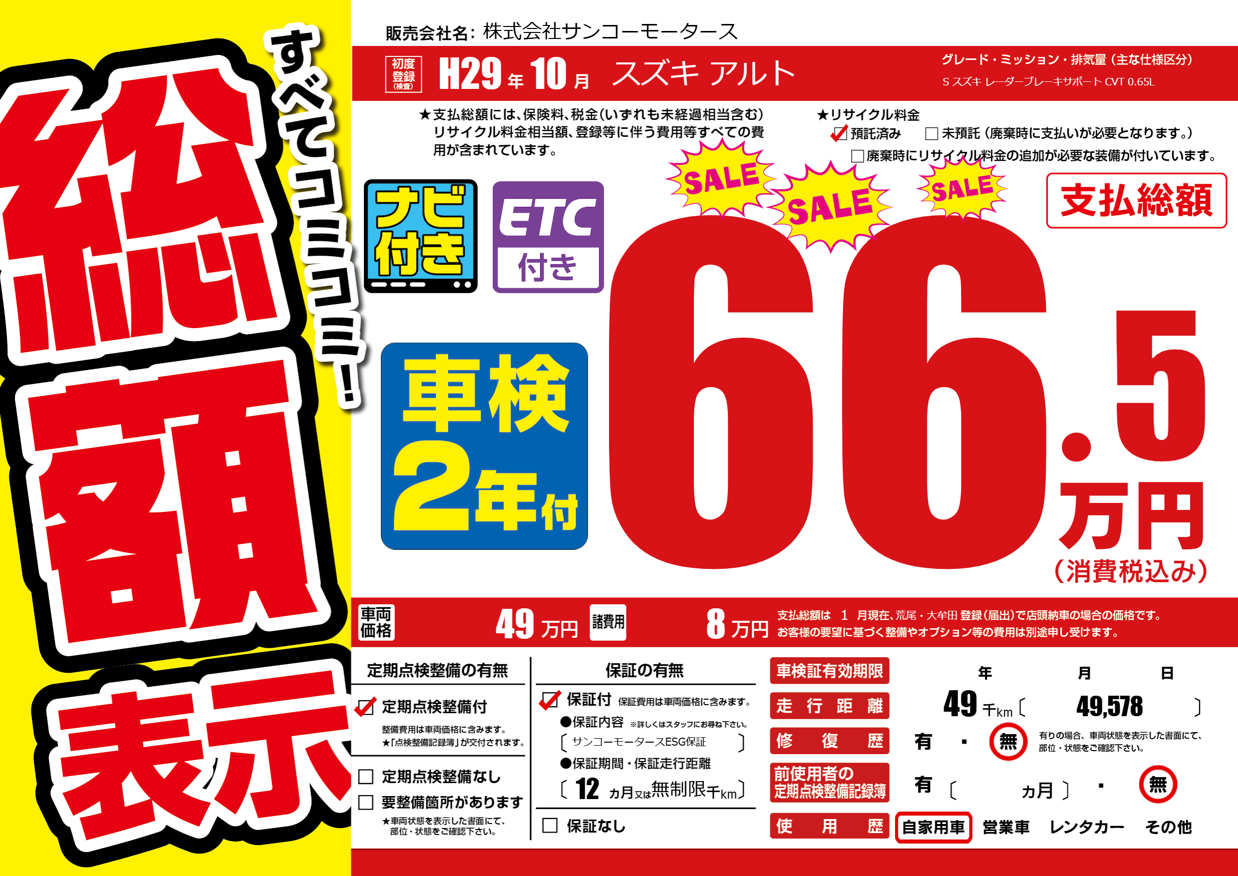 保証付き 保証内容(サンコーモータースESG保証) 12ヶ月または(無制限)千kmまで |