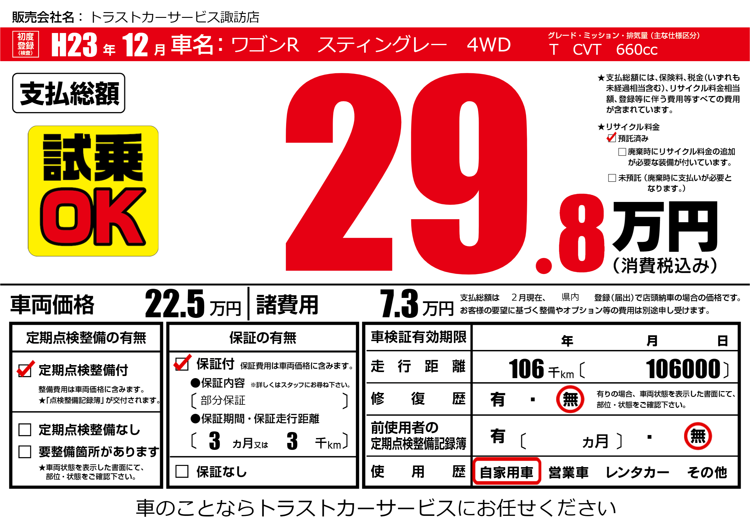 | 走行キロ | 10.6万km | 初年度登録 | H23年12月 |