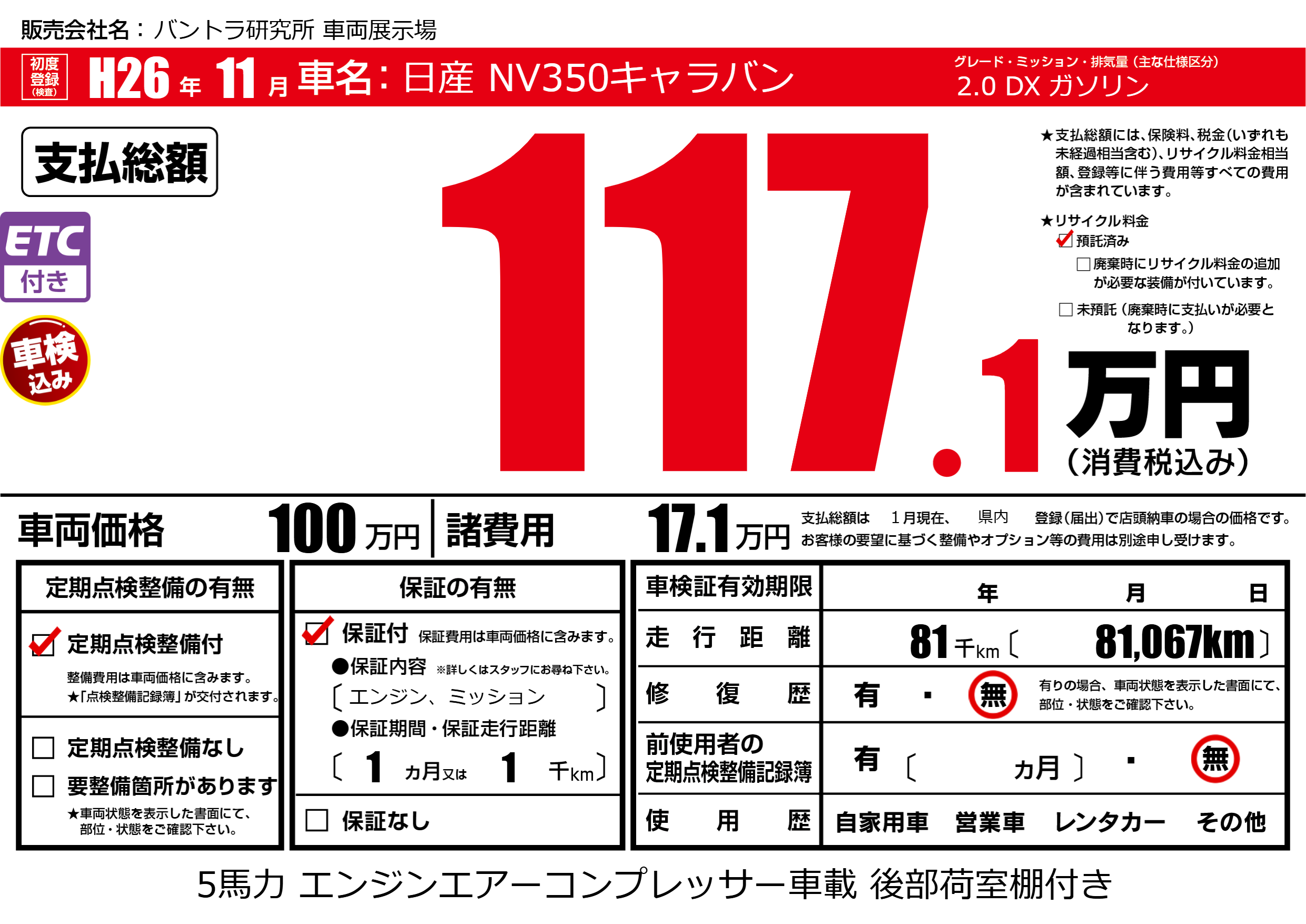 | 車名 | 日産 NV350キャラバン | グレード ミッション 排気量 |
