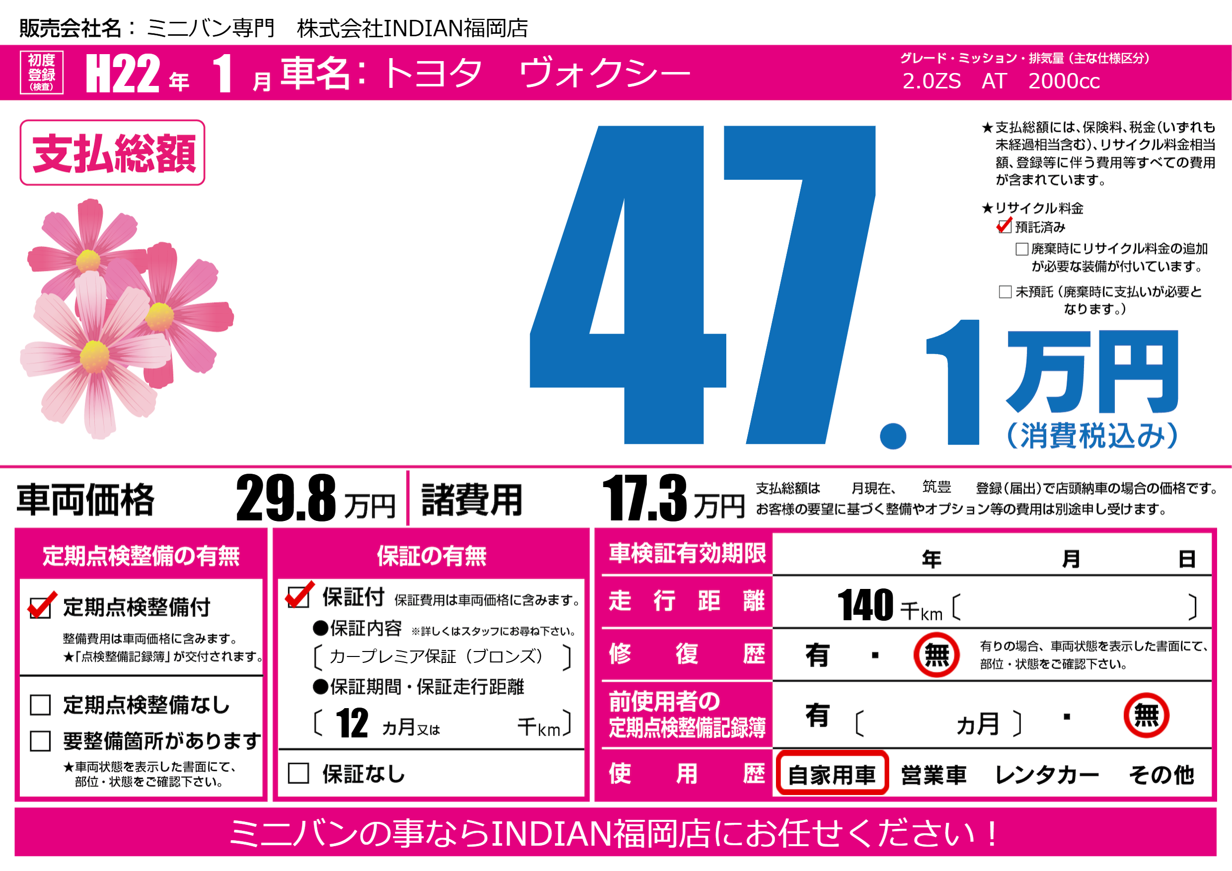 | 走行キロ | 14万km | 初年度登録 | H22年1月 |