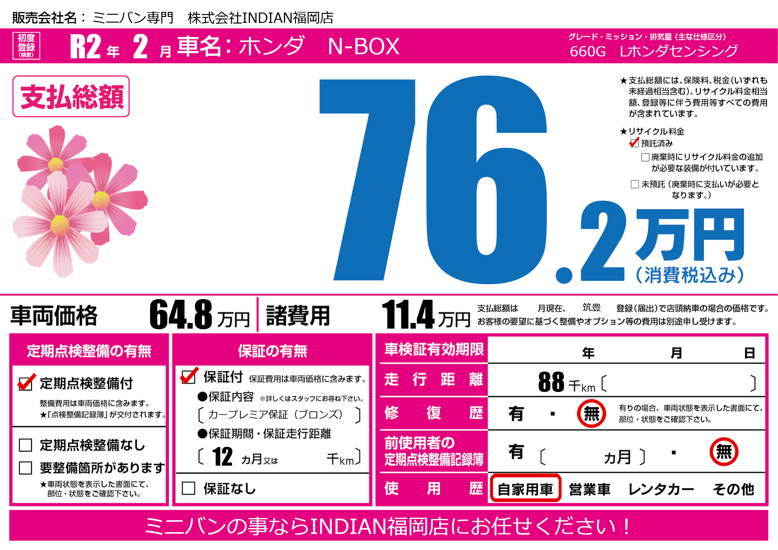 | 車名 | ホンダ N-BOX | グレード ミッション 排気量 |