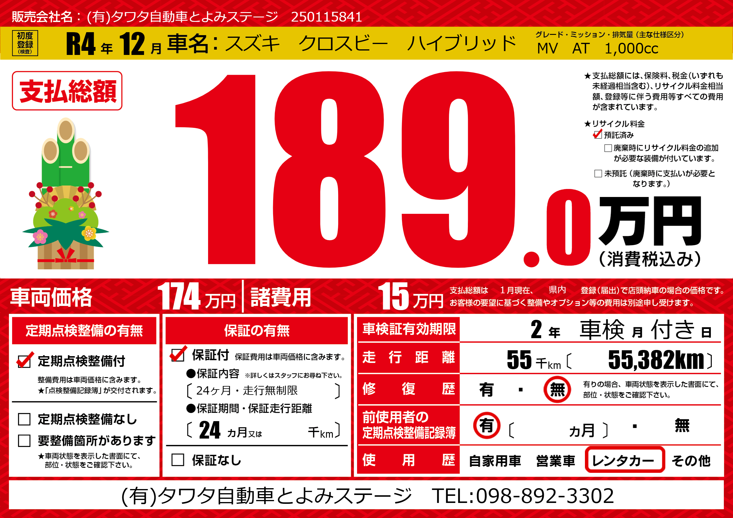 | 車名 | スズキ クロスビー ハイブリッド | グレード ミッション 排気量 |