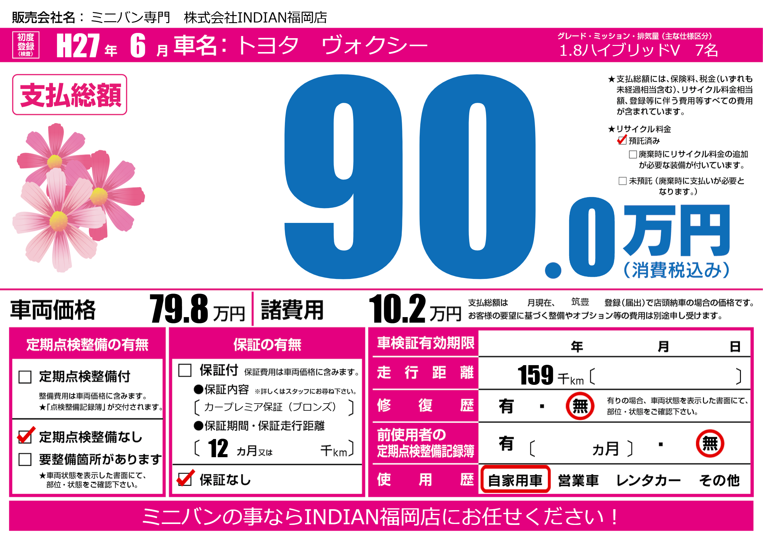 | 走行キロ | 15.9万km | 初年度登録 | H27年6月 |