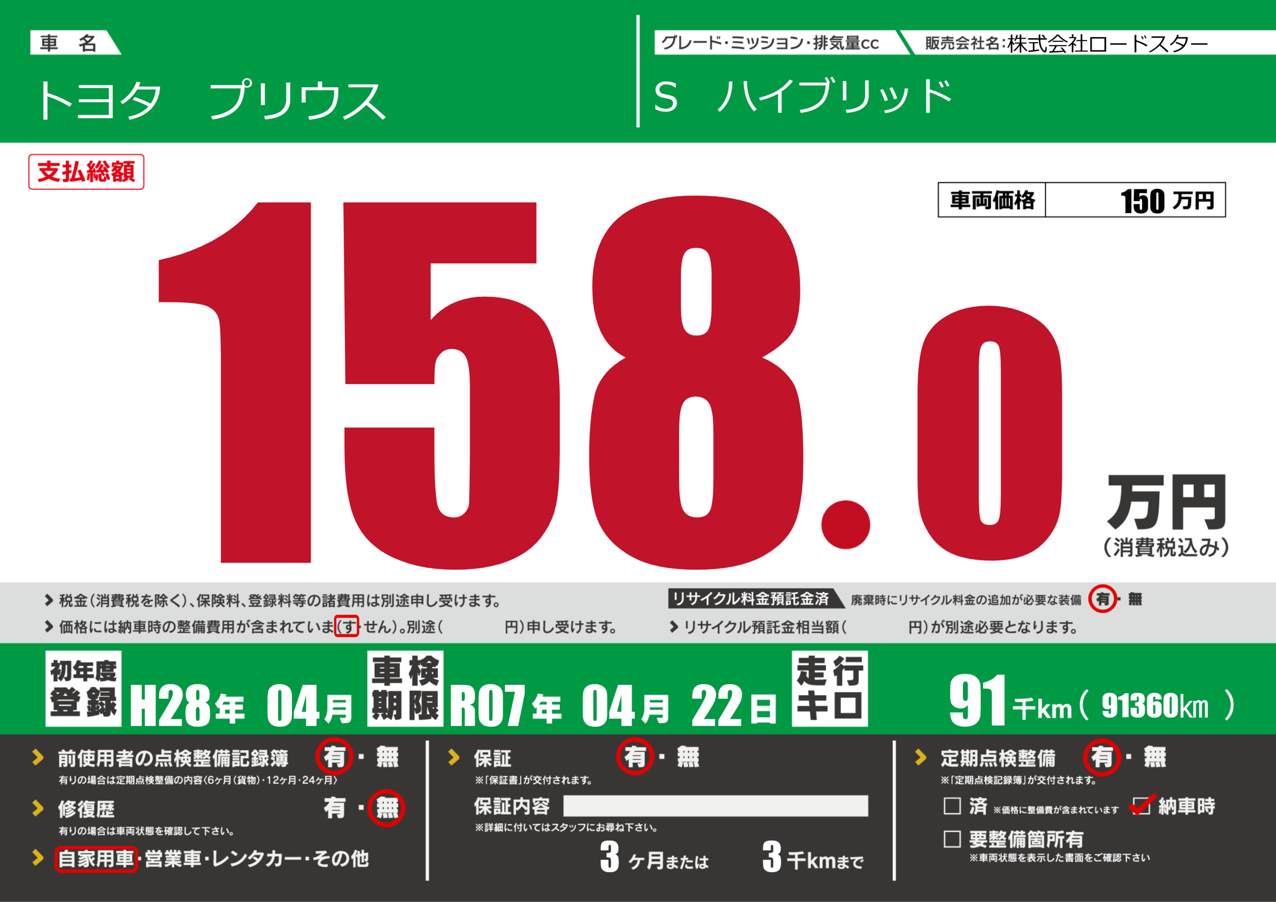 | 走行キロ | 9.1万km | 初年度登録 | H28年04月 |