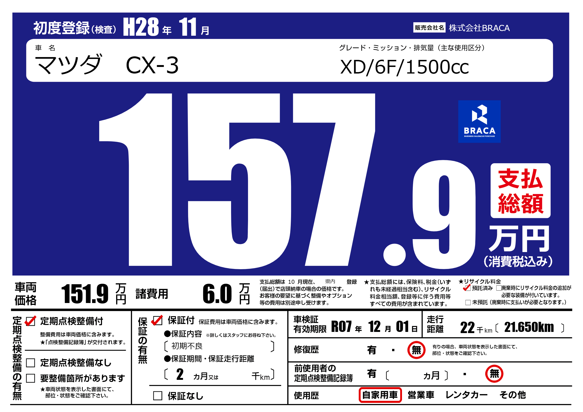 | 車名 | マツダ CX-3 | グレード ミッション 排気量 |