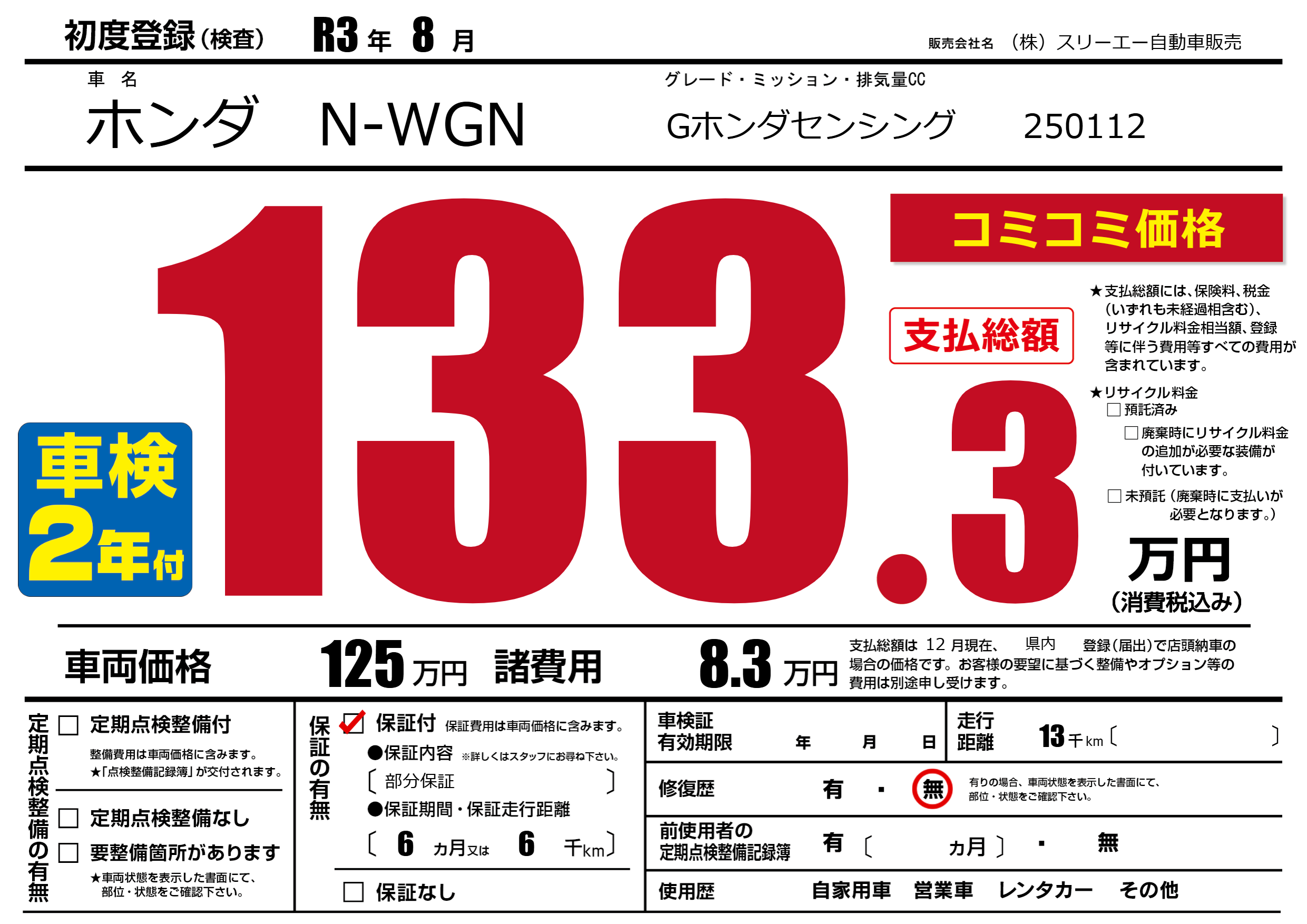 | 車名 | ホンダ N-WGN | グレード ミッション 排気量 |